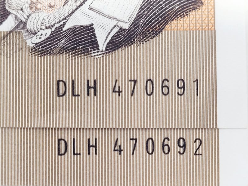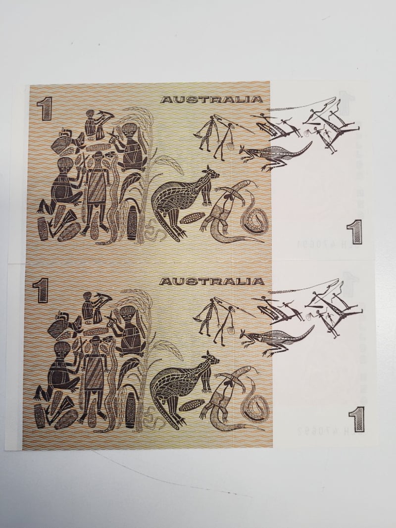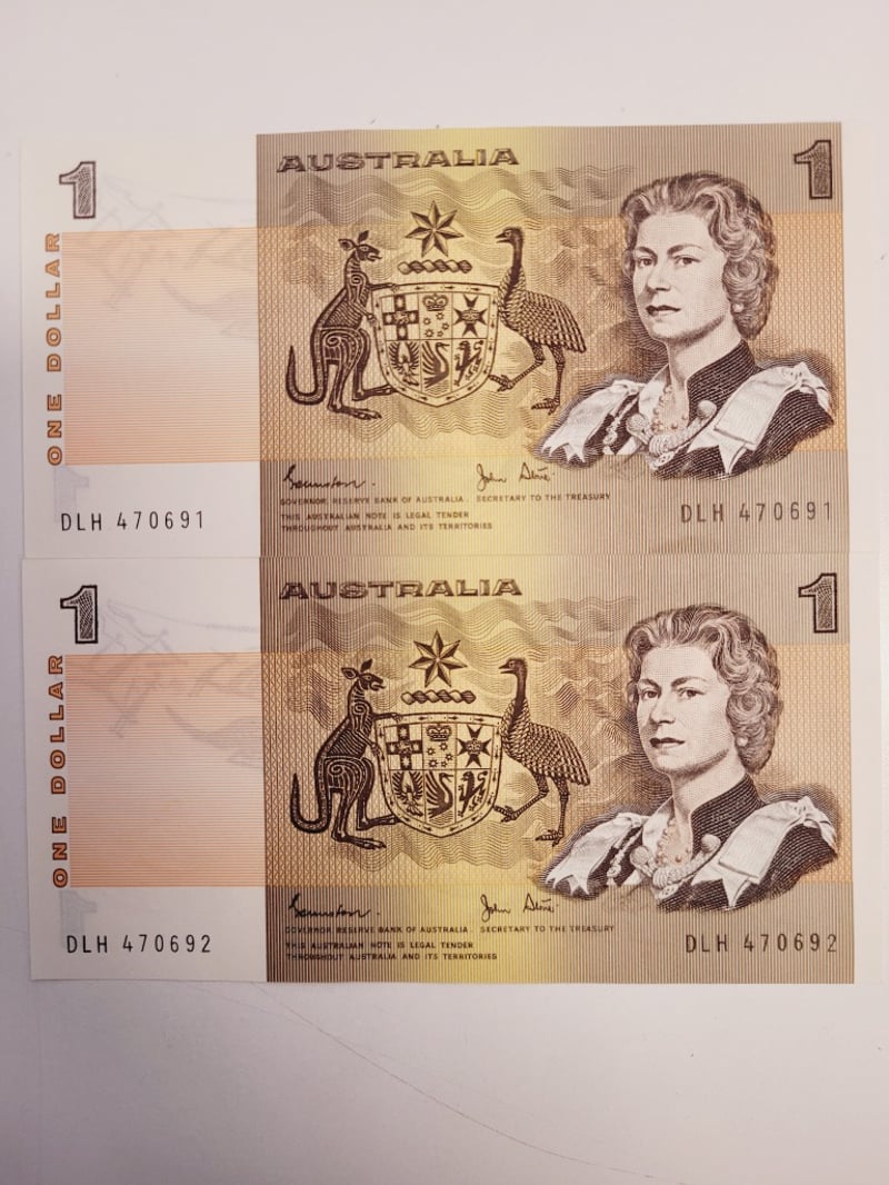 AUSTRALIAN $1 CONSECUTIVE BANKNOTES - J/STONE SIGNED. DLH470691-DLH470692, aUNC-UNC 488544+31