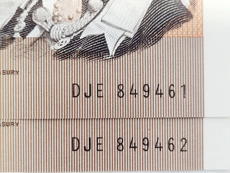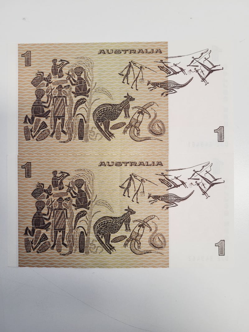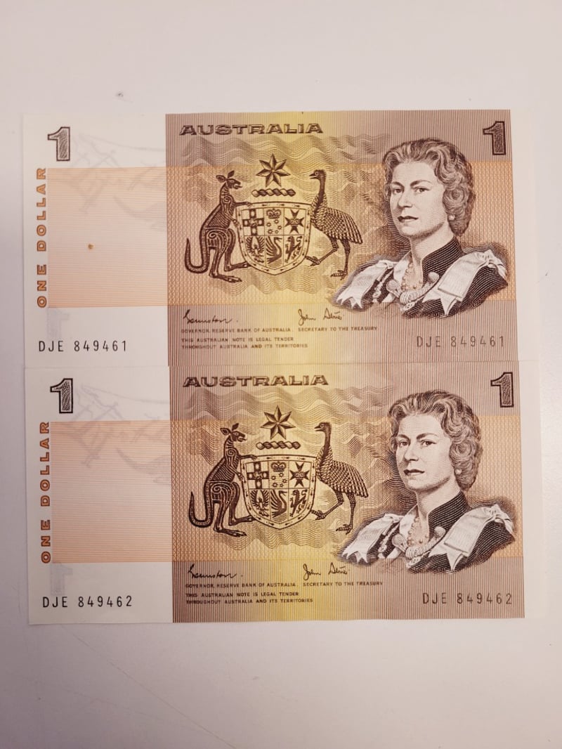 AUSTRALIAN $1 CONSECUTIVE BANKNOTES - J/STONE SIGNED. DJE849461-DJE849462, aUNC-UNC 488544+32