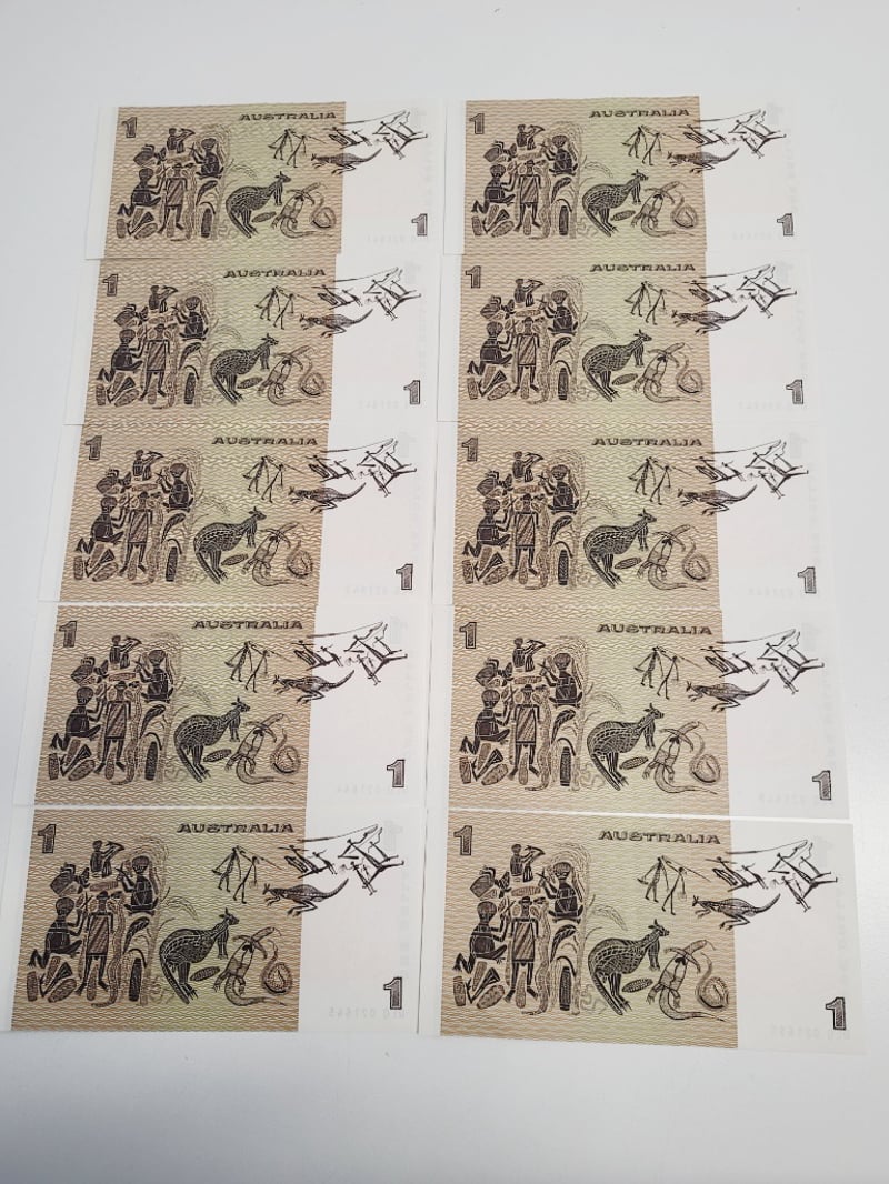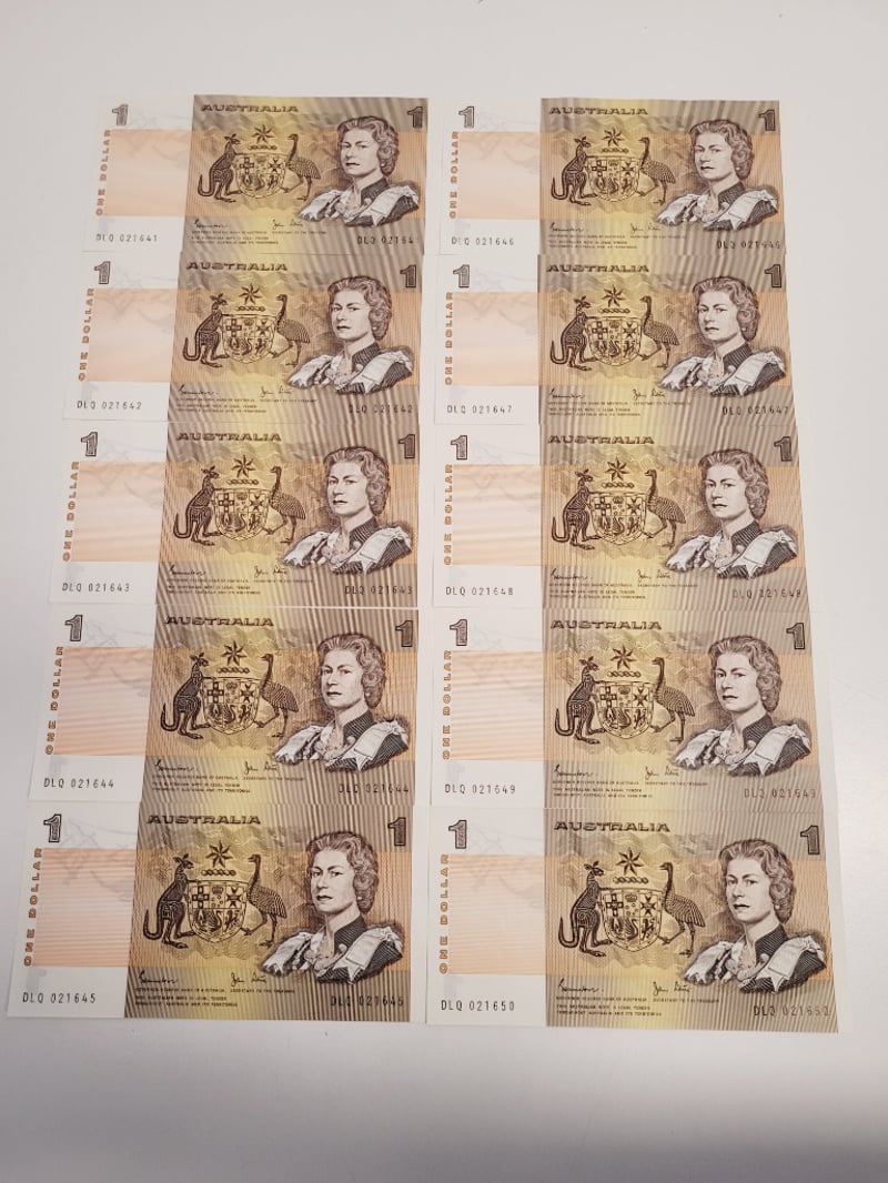 AUSTRALIAN $1 CONSECUTIVE BANKNOTES - J/STONE SIGNED. DLQ021641-DLQ021650, aUNC-UNC 488544+36