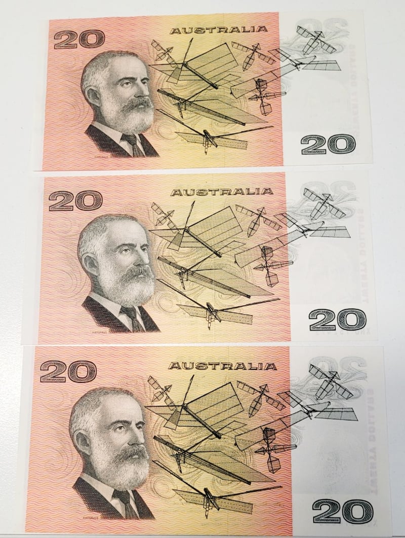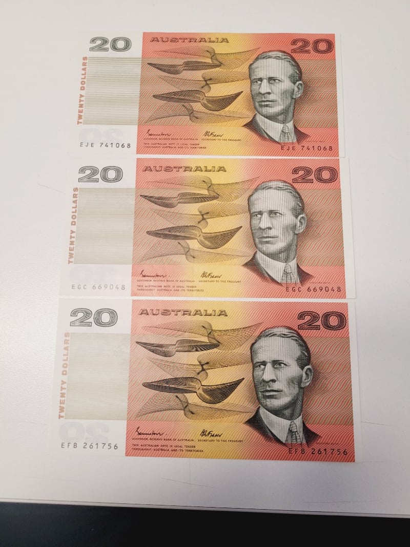 AUSTRALIAN $20 SIGNED BANKNOTE - EJE741068, EGC669048, EFB261756, R409A, AUNC488544+151