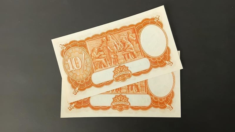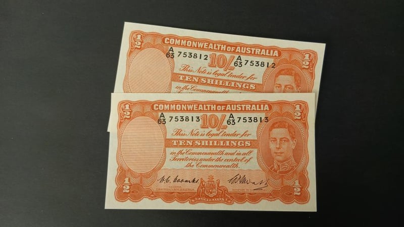1949 2 X 10 SHILLING NOTE (CV $ 2,100 REN 32 R14) Consecutive, High Grade, Coombs Watt Appears Unc 11600+10