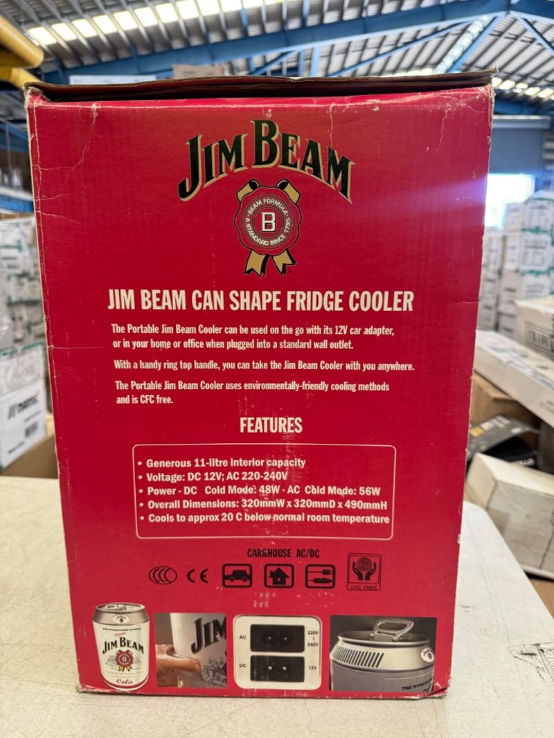 Novelty Jim Beam Branded Portable Electric Cooler In Can-Shaped Design With 11-Litre Capacity. Features Dual Voltage Operation (Dc 12V/Ac 220-240V), Ring Handle, And Environmentally-Friendly Cfc-Free Cooling System. Includes Car Adapter For Travel Use. Original Retail Packaging With Specifications And Imagery Intact.