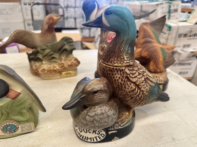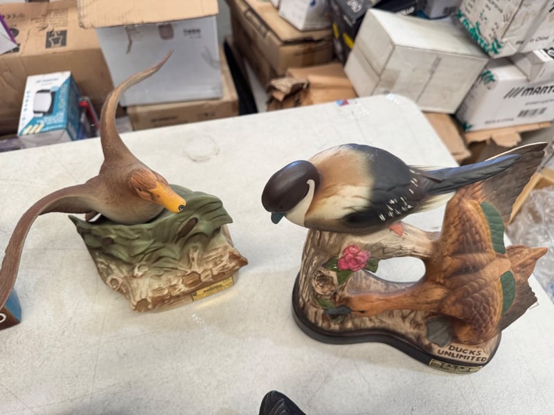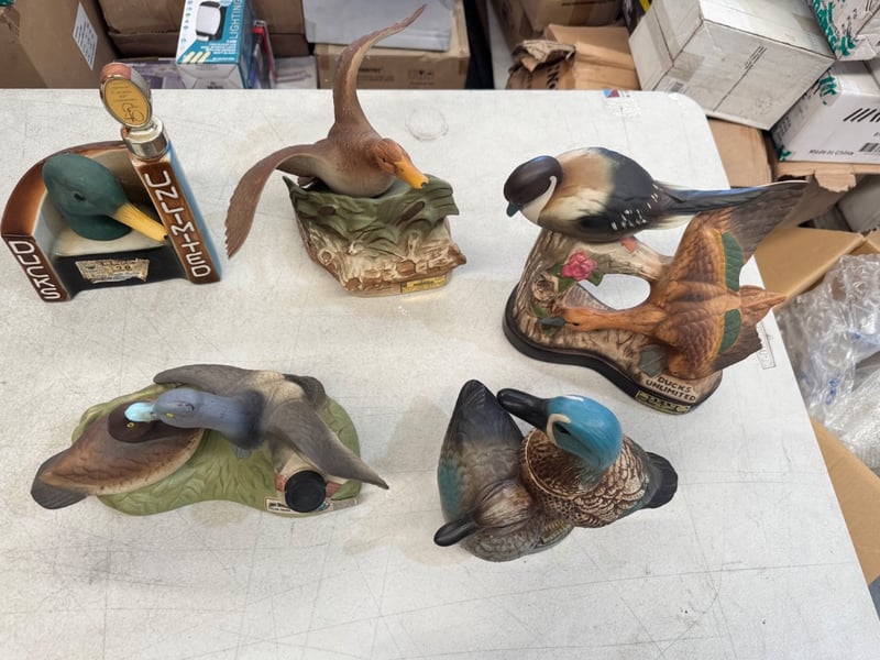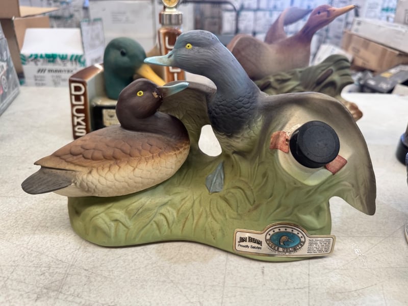 COLLECTION OF SIX VINTAGE DUCK DECOY FIGURINES AND BREWERIANA ITEMS Item Size: Height: 20cm, Width: 20cm, Depth: 20cm, Weight: 10Kg A Curated Collection Of Decorative Duck Decoy Figurines And Related Breweriana Memorabilia, Featuring Hand-Painted Ceramic And Composite Pieces. The Set Includes Multiple Detailed Waterfowl Sculptures In Naturalistic Poses, Predominantly In Green, Brown, And Teal Tones With Authentic Plumage Detailing. Notable Pieces Include A Jim Beam Ducks Unlimited 40Th Anniversary Commemorative Decanter With Gilt Stopper, Hand-Crafted Sculptural Bases Depicting Natural Habitat Scenes With Reeds And Foliage, Condition: Good - Refer To Images 584482+17