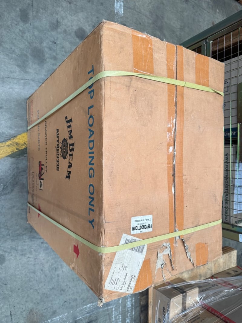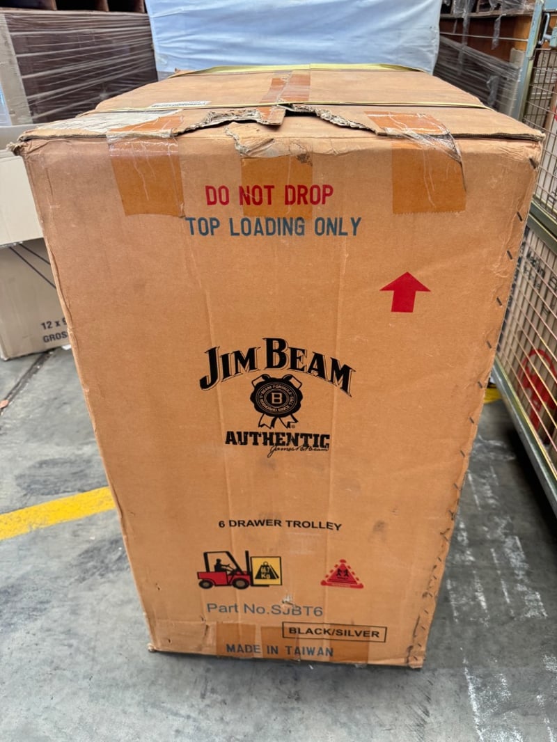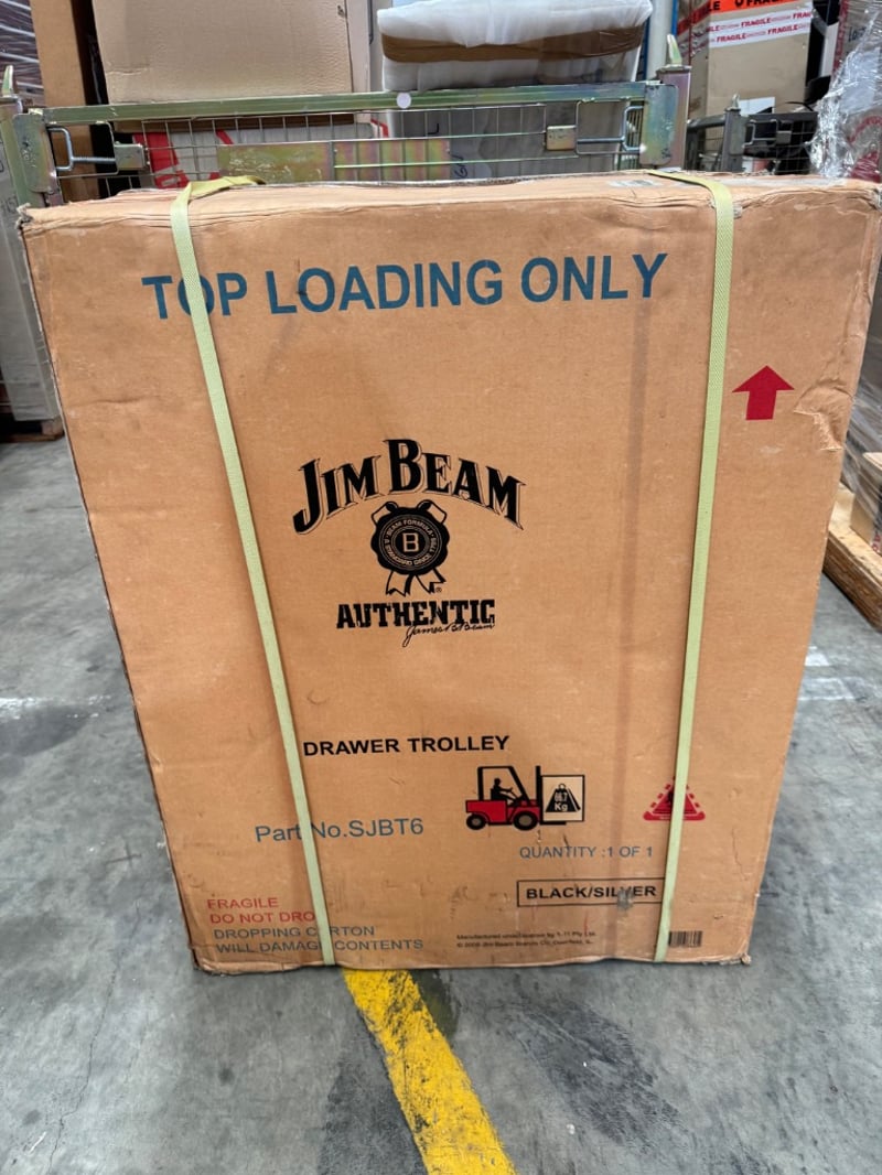 Jim Beam Authentic Branded 6-Drawer Bar Trolley Featuring Black And Silver Finish. Part No. Sjbt6, Manufactured In Taiwan. Features Top-Loading Only Configuration With Integrated Drawer Storage. Marked Fragile With Forklift And Drop Hazard Warnings.