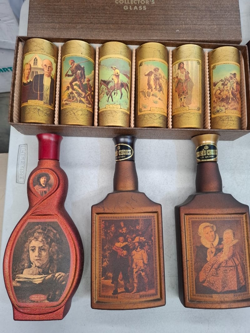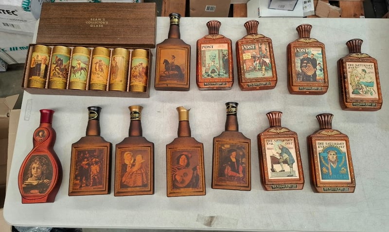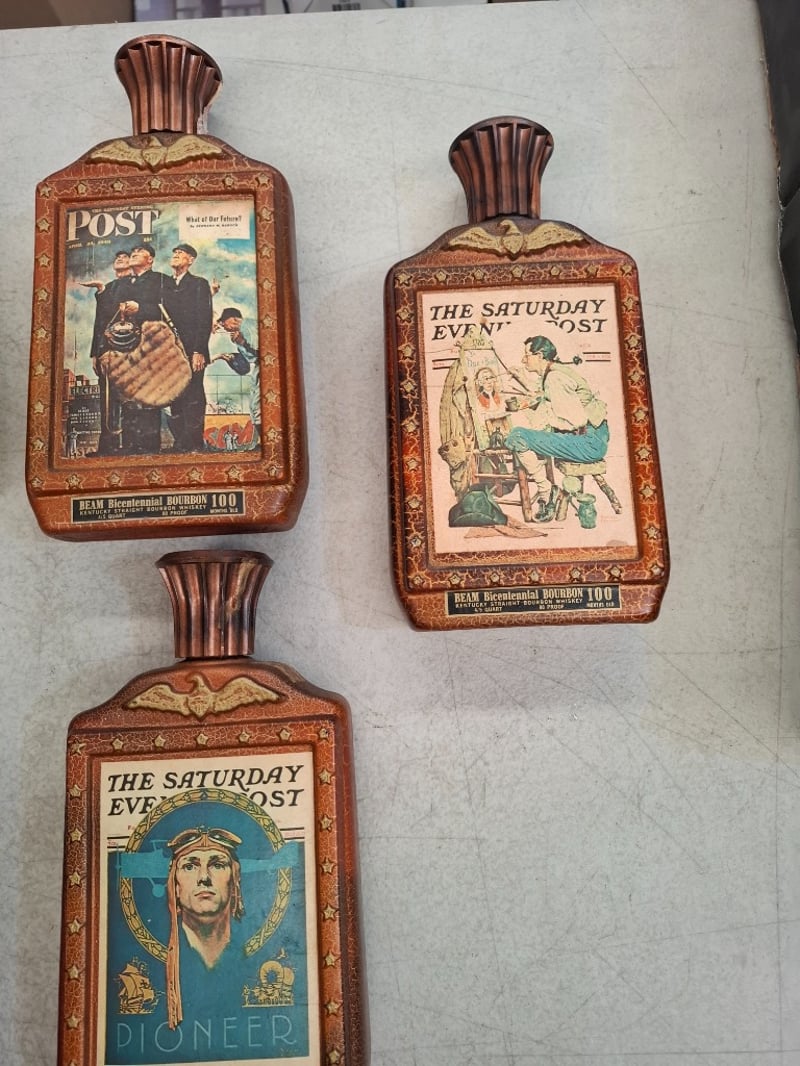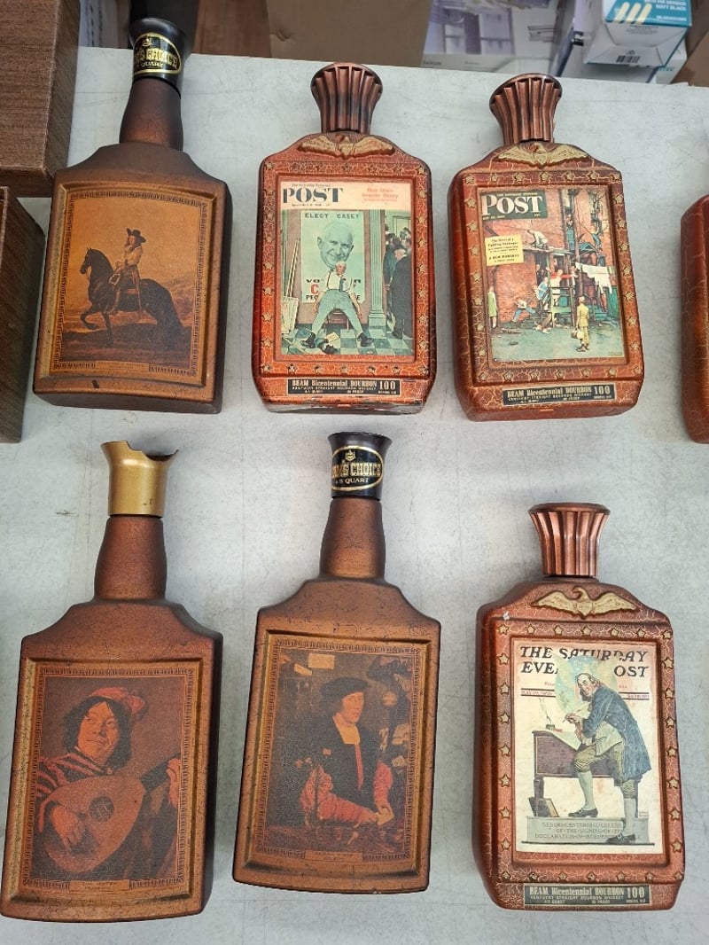 Exceptional Collection Of Jim Beam Bicentennial Bourbon Decanters Featuring Ceramic Vessels With Historical Illustrations. Set Includes Six Cylindrical Gold-Leafed Bottles Depicting Period Scenes, Multiple Rectangular Decanters Adorned With Saturday Evening Post Imagery And Character Portraits, A Red Ceramic Flask With Classical Female Portrait, And Original Wooden Beam'S Collector'S Glass Presentation Box. The Collection Showcases Authentic Vintage Americana Aesthetics With Rich Earth Tones, Or