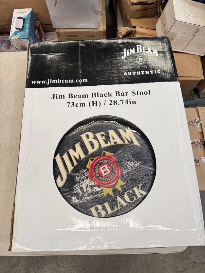 JIM BEAM BLACK BAR STOOL - AUTHENTIC BRANDED MERCHANDISE Item Size: Height: 73cm, Width: 20cm, Depth: 20cm, Weight: 15Kg Official Jim Beam Black Bar Stool Featuring The Iconic Bourbon Brand Logo And Branding. Circular Seat With Jim Beam And Black Label Graphics. Standing Height Of 73Cm (28.74 Inches). Designed In Australia, Made In China. Product Code 8016Jb. Distributed By Eastcoast Australia, Seven Hills Nsw. Condition: Fair - Refer To Images 584482+29
