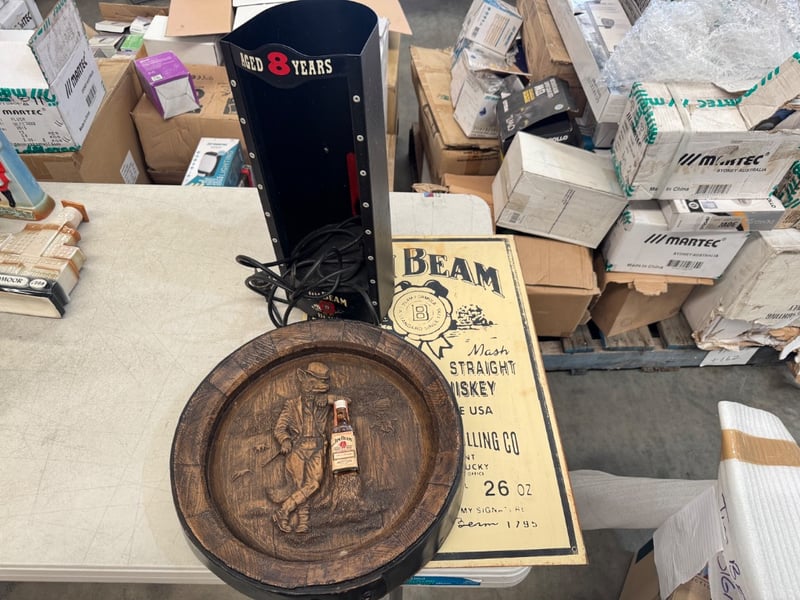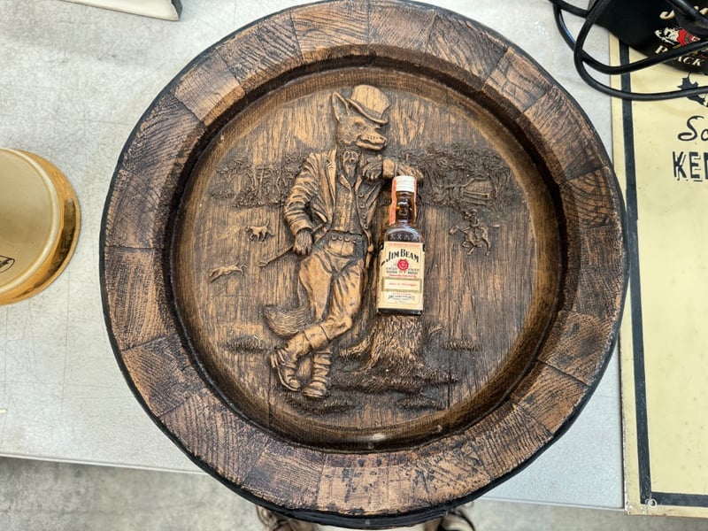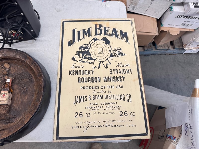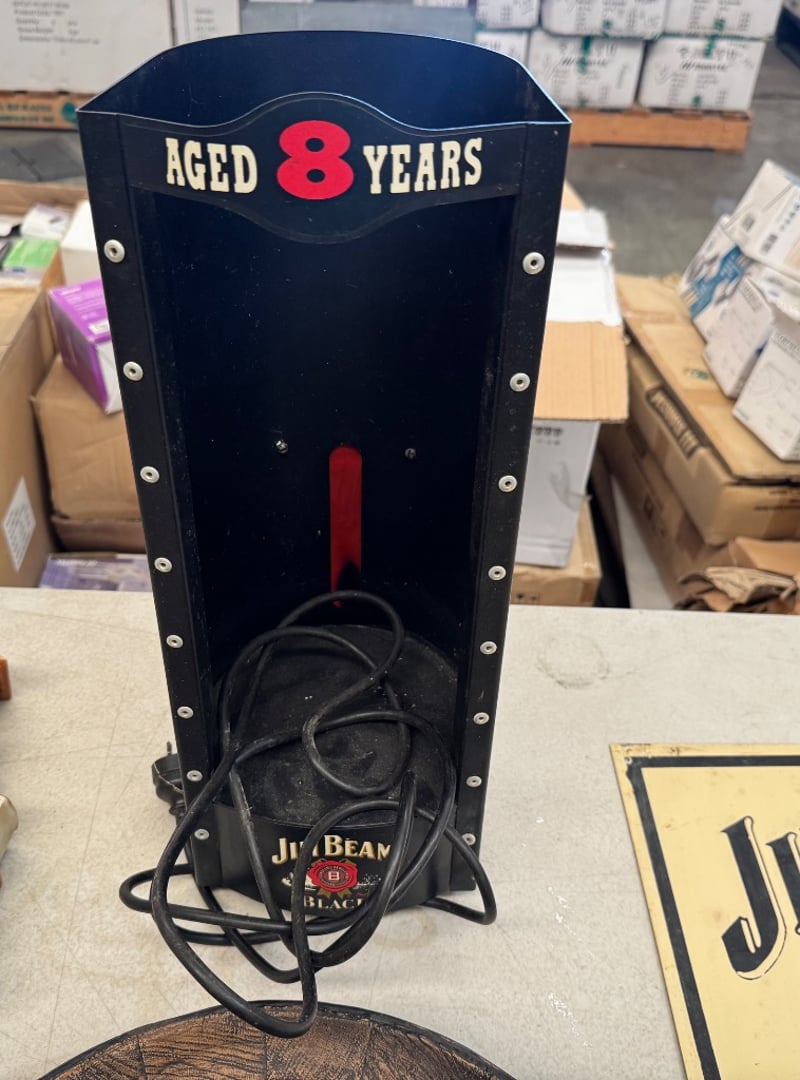 Vintage Jim Beam Promotional Display Set Featuring A Hand-Carved Wooden Barrel Head Depicting A Distiller Figure, Paired With An Original Cream-Coloured Label Advertising "Sour Mash Kentucky Straight Bourbon Whiskey" (26 Oz, 37.2% Abv) Distilled By James B. Beam Distilling Co., Beam Clermont, Frankfort Kentucky. Includes A Black Metal Light-Up Display Box Marked "Aged 8 Years" With Electrical Cord. Label Dated To Original 1795 Founder Signature Reference. Decorative And Functional Advertising Me