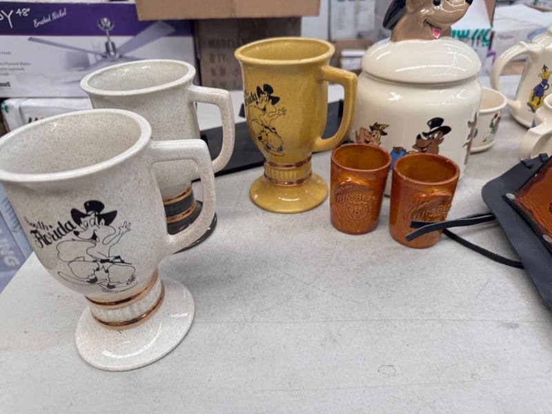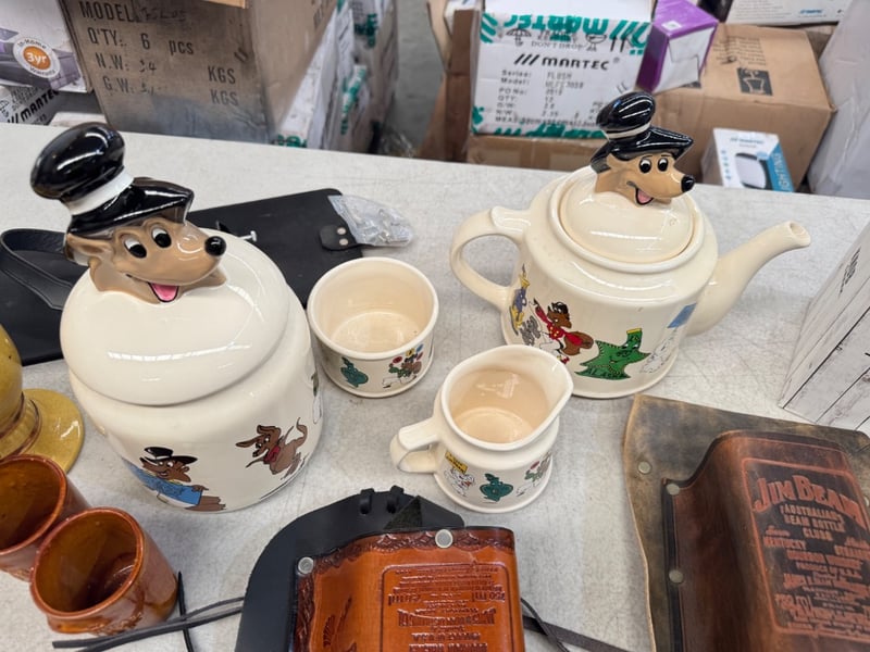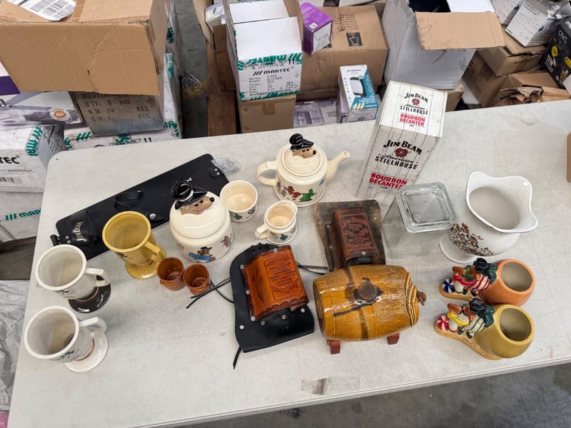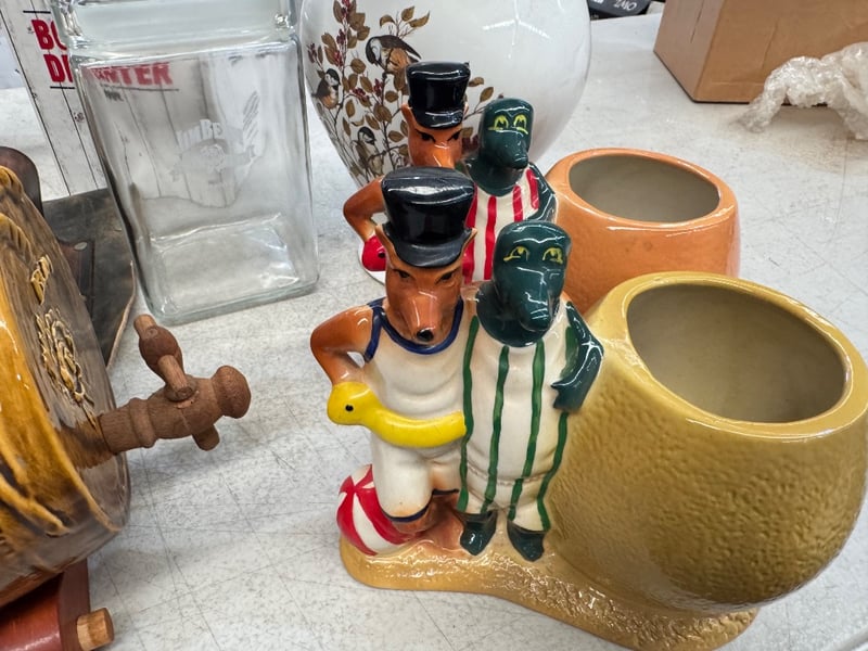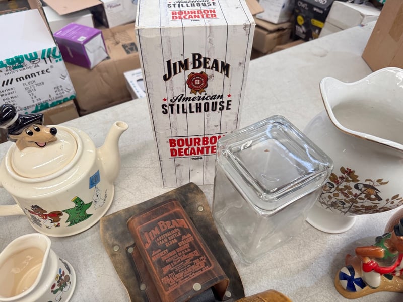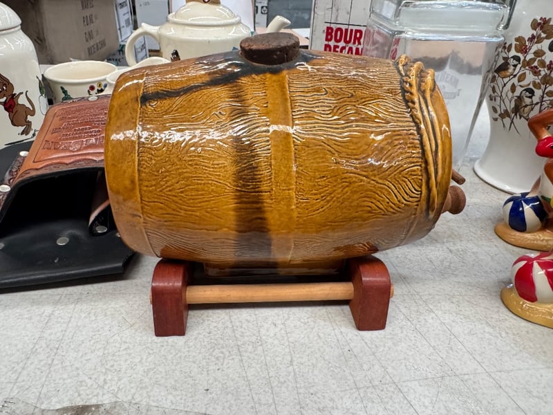 VINTAGE CERAMIC NOVELTY BARREL AND COLLEC OF JIM BEAM MERCHANDISE TEAPOT WITH HAND-PAINTED DECORATION