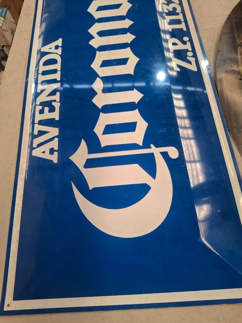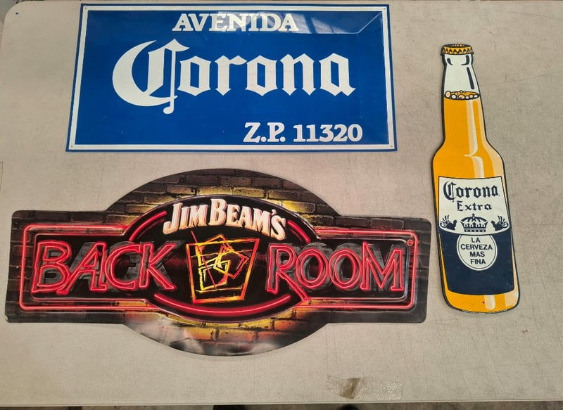 Collection Of Three Vintage Metal Advertising Signs Featuring Iconic Beer And Spirits Brands. Includes A Blue Enamel Corona Avenida Sign With Postal Code Z.P. 11320, A Jim Beam Back Room Neon-Style Sign With Illuminated Red Lettering, A Large Guinness Blue Enamel Sign, And A Vintage Bar/Pub Neon Sign Reading "Bar". The Pieces Showcase Classic Mid-Century Advertising Aesthetics With Combination Of Hand-Painted Enamel Work And Neon-Effect Graphics. Signs Display Authentic Patina And Wear Consisten