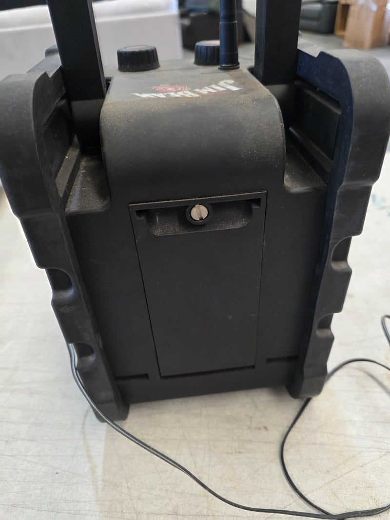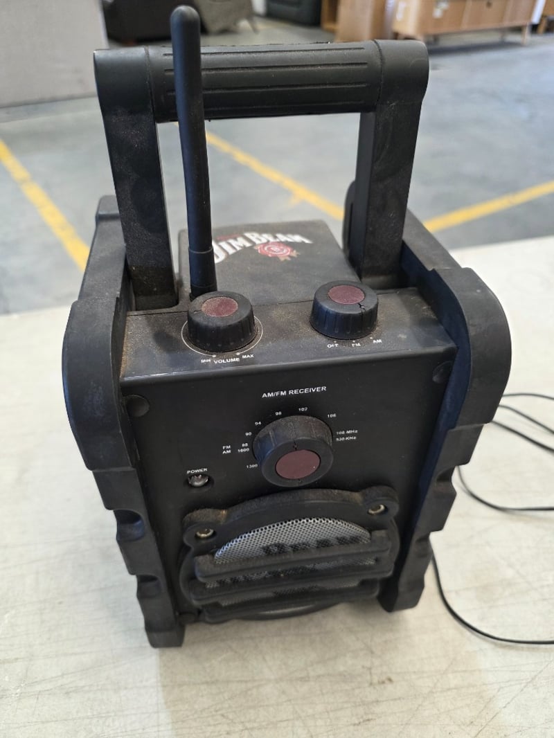 Vintage Jim Beam Branded Am/Fm Receiver Housed In A Robust Black Rubberised Carry Case With Integrated Handle And Shoulder Straps. Features Dual Control Knobs For Volume And Tuning, Extendable Antenna, Built-In Speaker Grille, And Power Switch. Rugged Portable Design Suitable For Construction Sites Or Outdoor Use. Shows Patina Consistent With Age And Field Use.