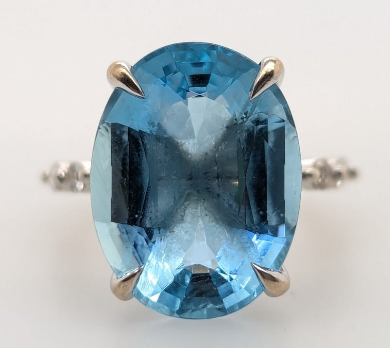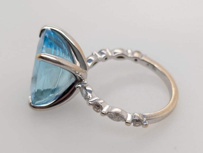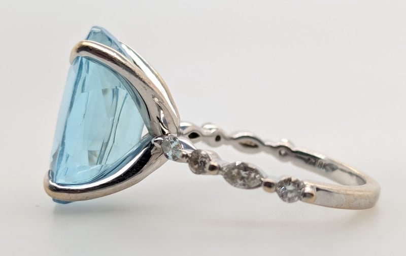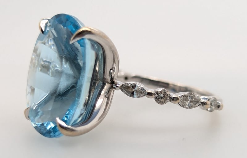 First Ring Features Oval Cut Aquamarine In Centre Four Claw Setting, Ring Band Features Four Marquise Cut White Diamonnds And Four Round Cut White Diamonds In Two Claw Settings Claw Settings,