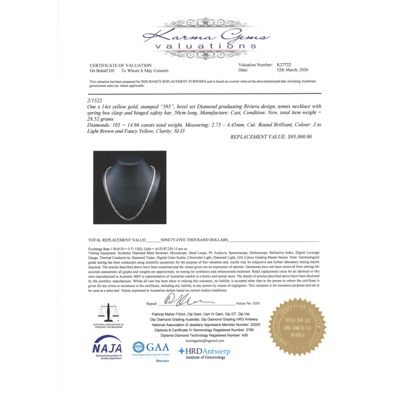 14K YELLOW GOLD, 14.86CT TDW DIAMOND, RIVIERA NECKLACE.