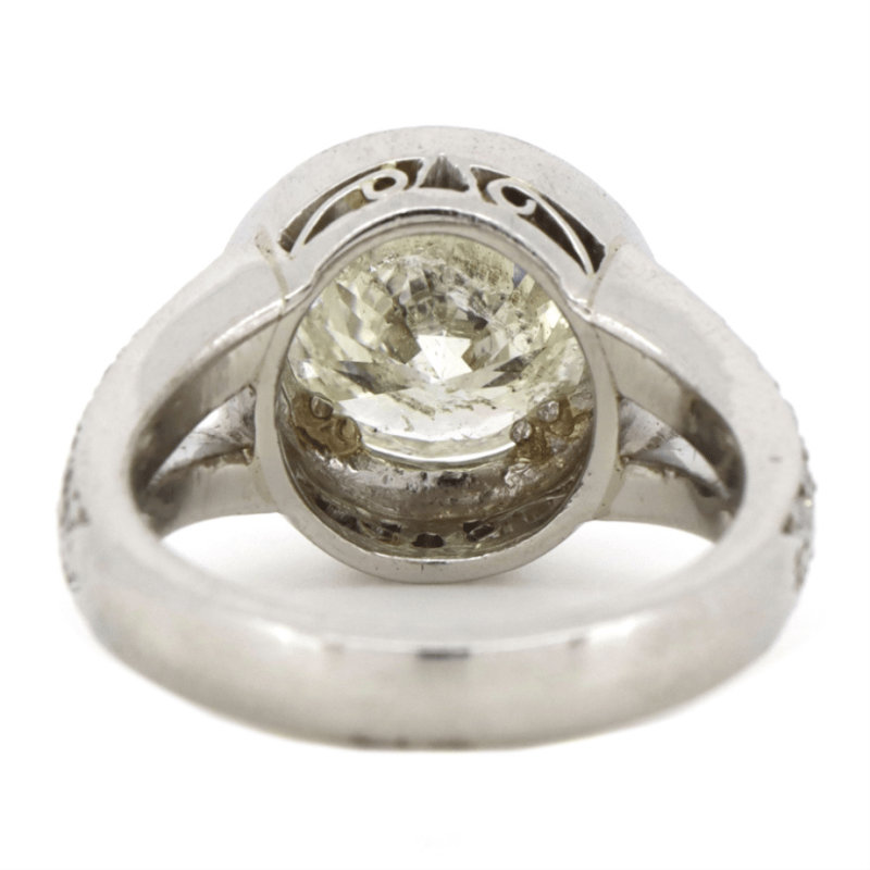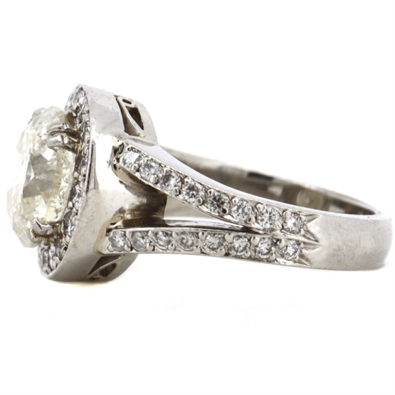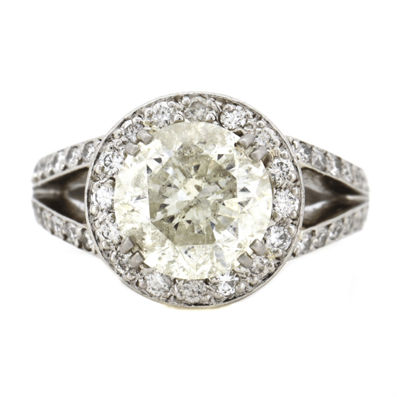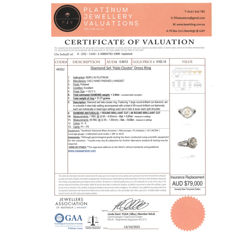 The Centre Features, One Round Brilliant Cut, Diamond (3.51Ct, H-K Colour, P1-P2 Clarity), Claw Set. Surrounding The Centre In A Halo And Decorating The Band Are, 48 Round Brilliant Cut, Diamonds (0.53Ct Tdw, H-K Colour, P1-P2 Clarity), Bead Set. Ring Size K 1/2.