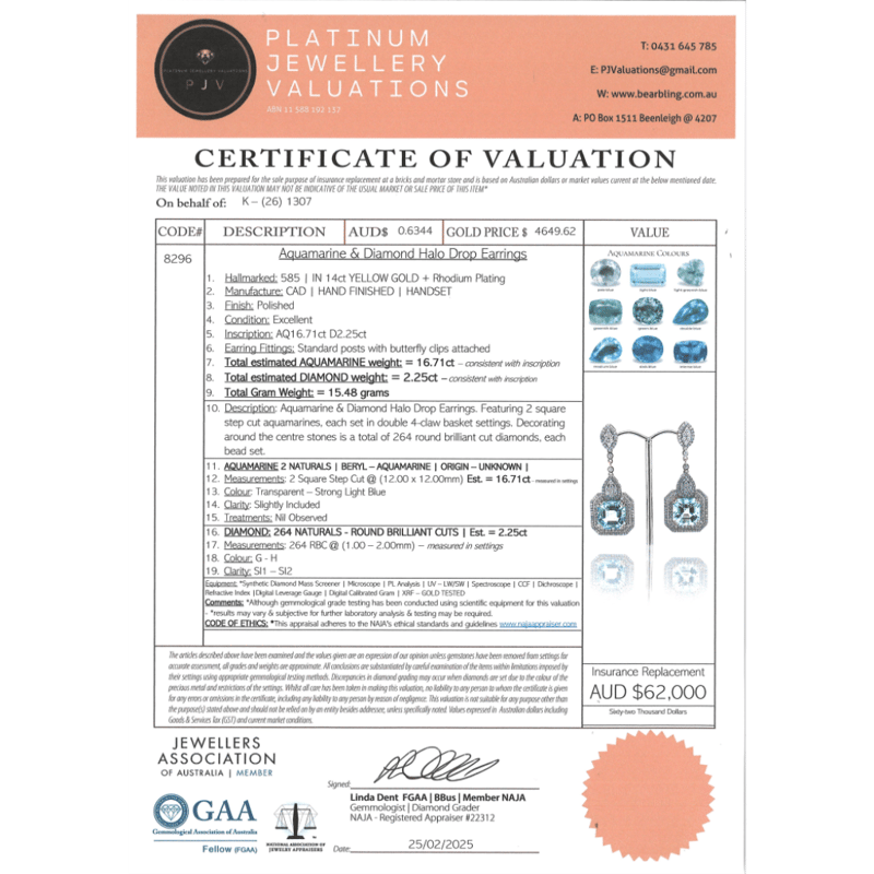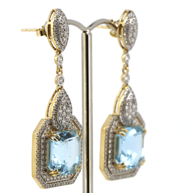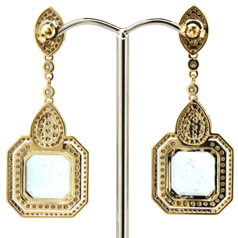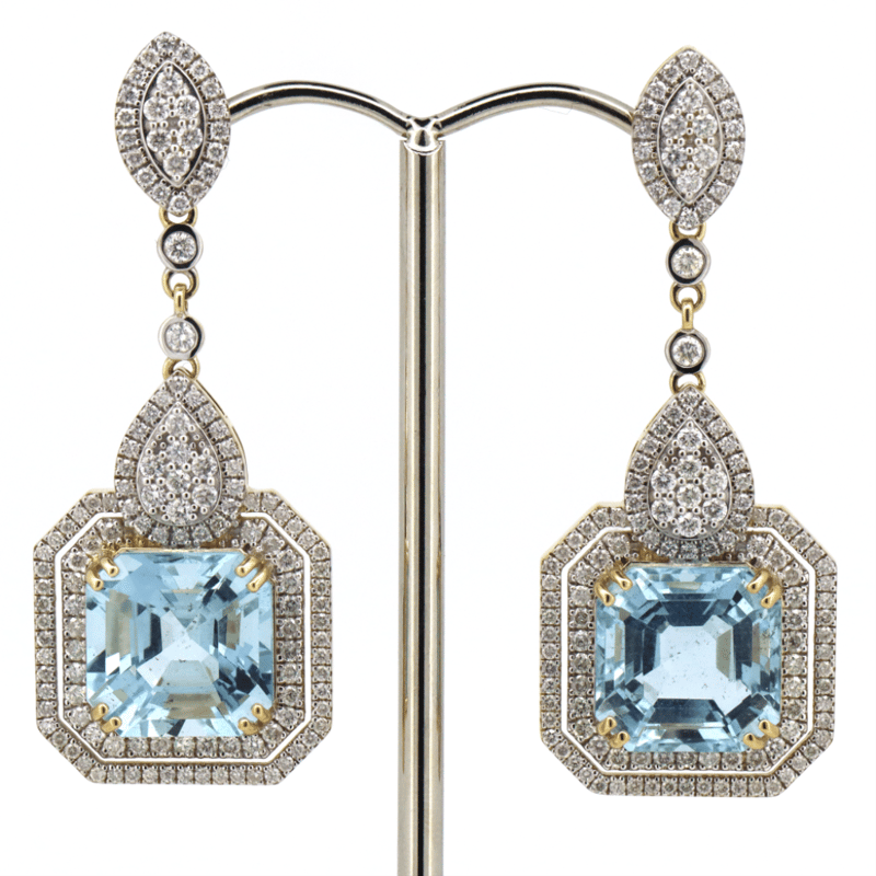 The Centres Feature, 2 Square Step Cut, Strong Light Blue, Aquamarines (16.71Ct Tsw, Slightly Included), Double 4 Claw Basket Set. Decorating The Centre Are, 264 Round Brilliant Cut, Diamonds (2.25Ct Tdw, G-H Colour, Si1-Si2 Clarity), Bead Set. The Earrings Feature, Standard Posts With Butterfly Clips.