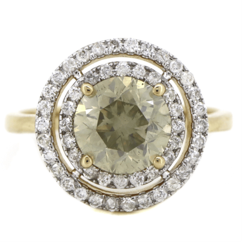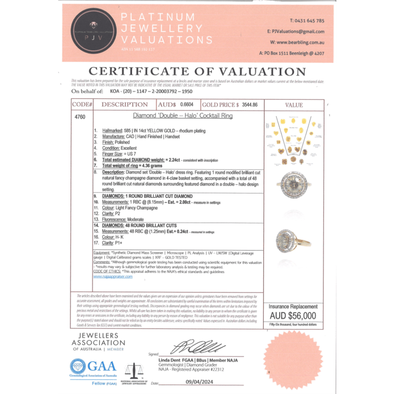 The Centre Features, One Round Brilliant Cut, Light Fancy Champagne, Diamond (2.00Ct, P2 Clarity), 4-Claw Set. Surrounding The Centre In A Double Halo Are, 48 Round Brilliant Cut, Diamonds (0.24Ct Tdw, H-K Colour, P1+ Clarity), Bead Set. Ring Size N 1/2.