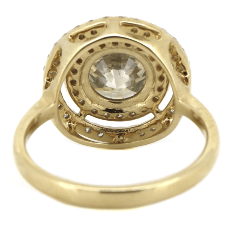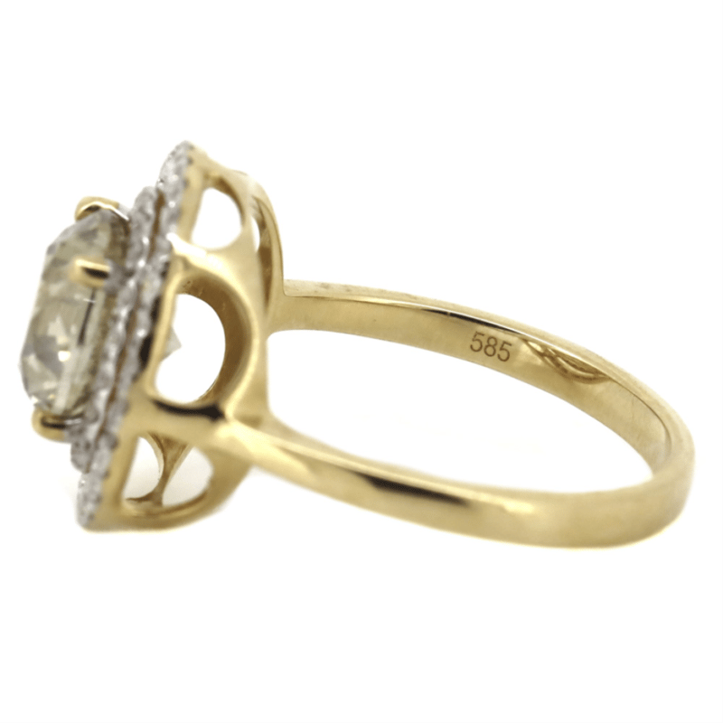 14K YELLOW GOLD, FANCY CHAMPAGNE DIAMOND, DOUBLE HALO RING.