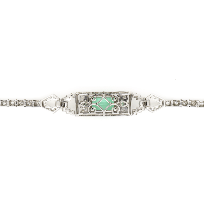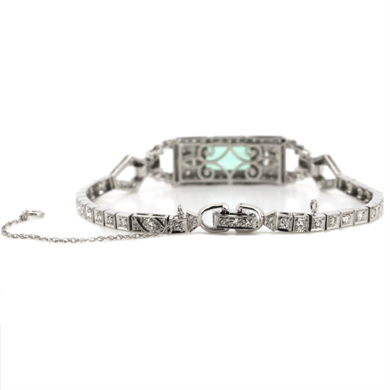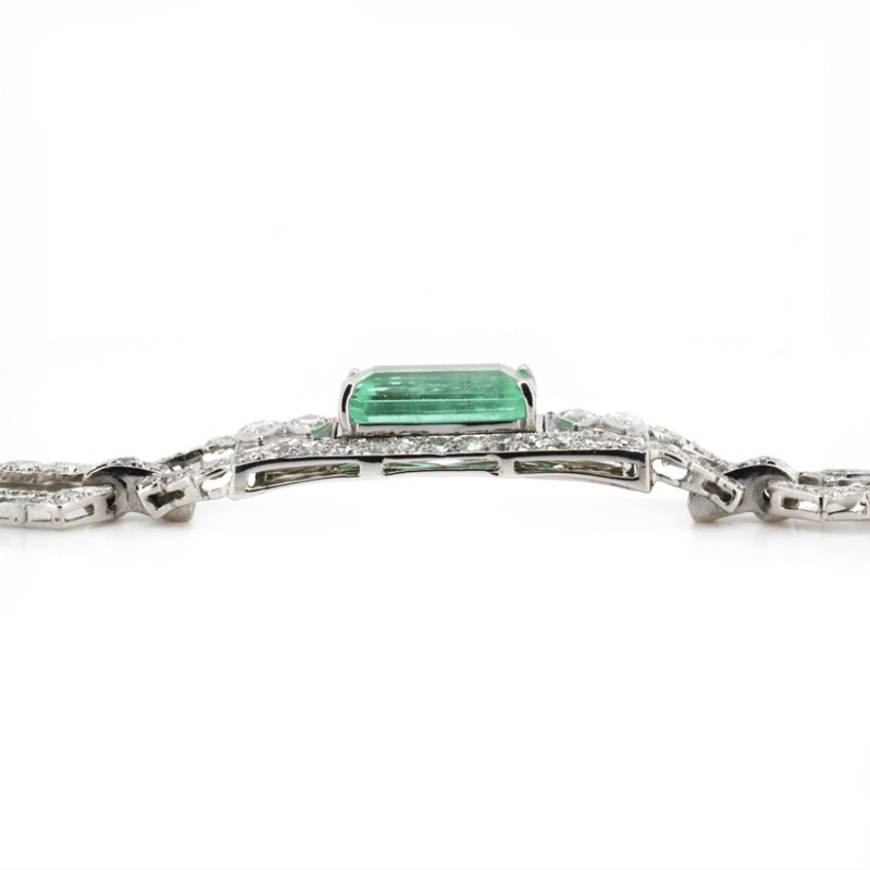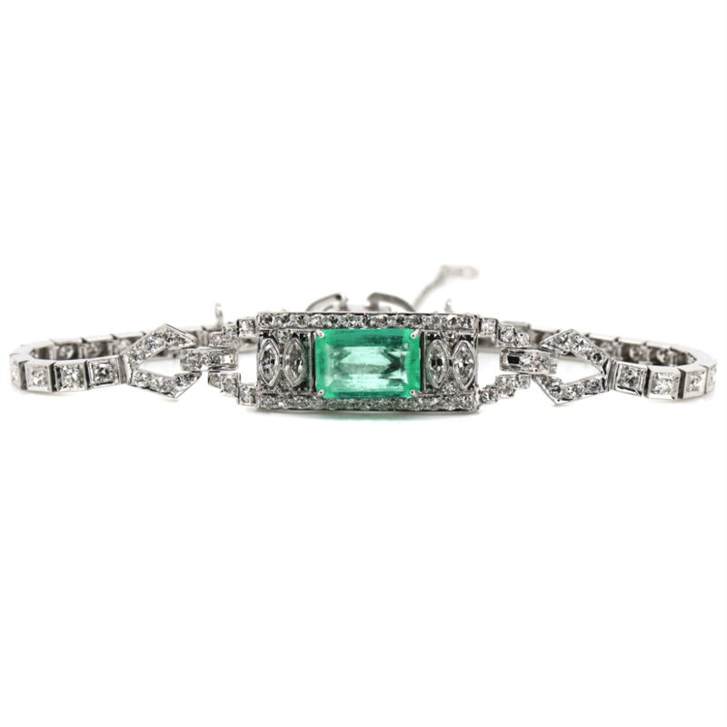 14K WHITE GOLD, 2.57CT COLOMBIAN EMERALD AND DIAMOND, ART DECO INSPIRED BRACELET.