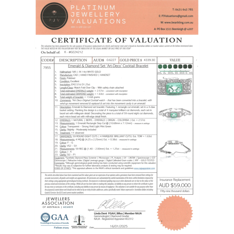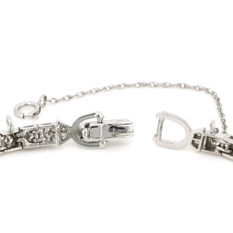 The Centre Features, One Emerald Rectangle Step Cut, Strong Vivid Light Mint Green, Colombian Emerald (2.57Ct, Slight-Moderate Inclusions), 4 Claw Set. Decorating Either Side Of The Centre Are, 4 Marquise Brilliant Cut, Diamonds (0.38Ct Tdw, F-G Colour, Vs2-Si1 Clarity), Bezel Set With Millegrain Detail. Embellishing The Bracelet Are, 59 Round Eight Cut, Diamonds (1.25Ct Tdw, J-K Colour, Si2-P2 Clarity), Micro-Claw Set With Millegrain Detail. The Bracelet Has A Hinged Fond Over Clasp With A Bolt Clasp Safety Chain. Bracelet Length Is 16.5Cm