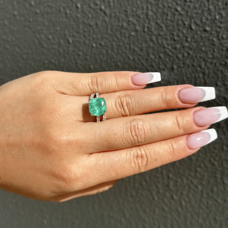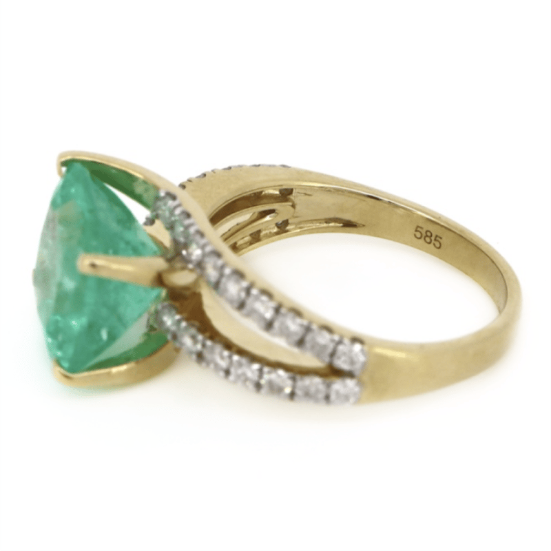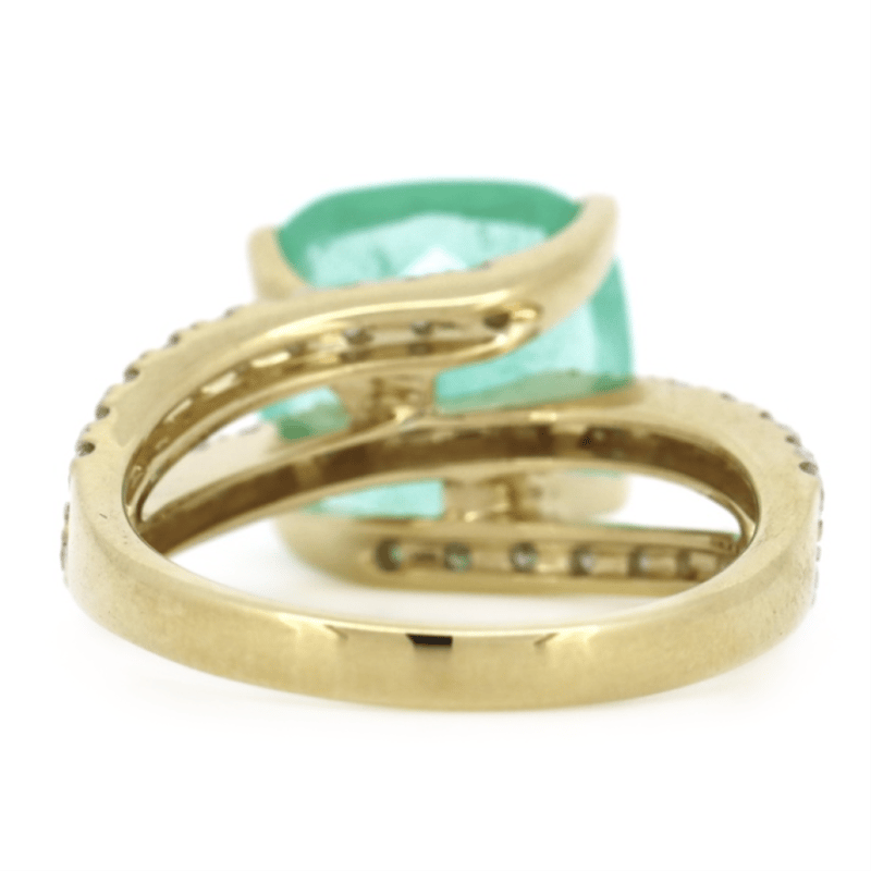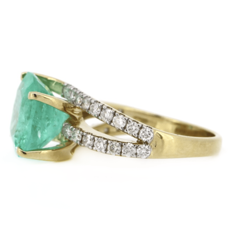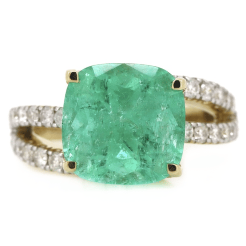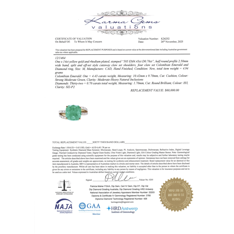 14K YELLOW GOLD, 4.43CT COLOMBIAN EMERALD AND DIAMOND, SPLIT BAND RING. The Centre Features, One Cushion Mixed Cut, Strong Moderate Green, Colombian Emerald (4.43Ct, Moderately Included), 4 Claw Set. Decorating The Split Band Are, 32 Round Brilliant Cut, Diamonds (0.70Ct Tdw, H-I Colour, Si2-P1 Clarity), Bead Set. Ring Size M. Valuations Provided by an Independent Third-Party Professional Not Directly Associated With Lloyds Auctions at AUD $$60,000.00This valuation has been conducted by an independent third-party professional. The valuation amount is an assessment by the issuing valuer and does not reflect the auction value of the item. Any inquiries regarding the valuation should be directed to the issuing valuer (refer to contact details on the certificate), as Lloyds Auctions has no affiliation or influence over the valuation, the valuer, or the stated amount. Condition: Good - Refer Images 0645979+9440