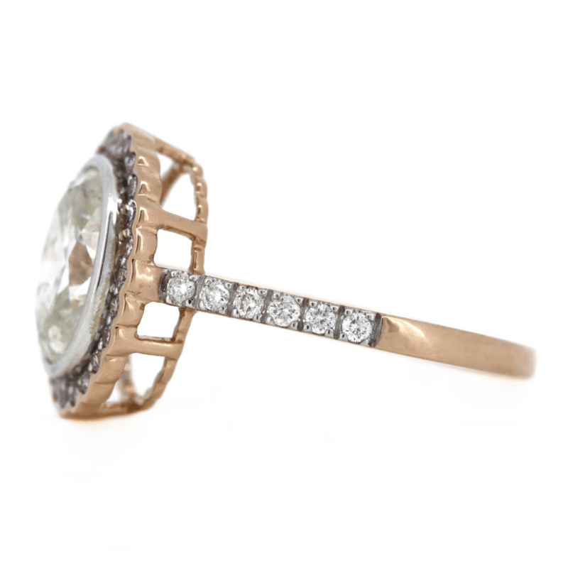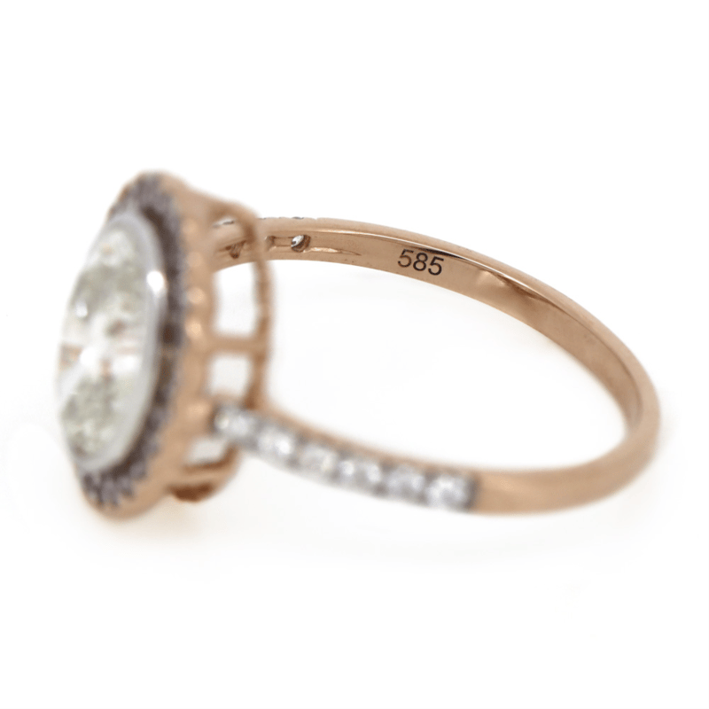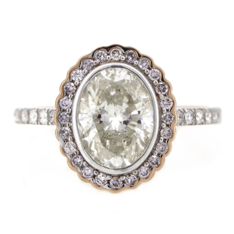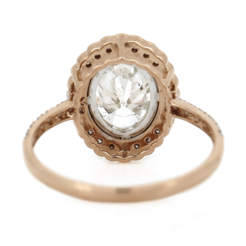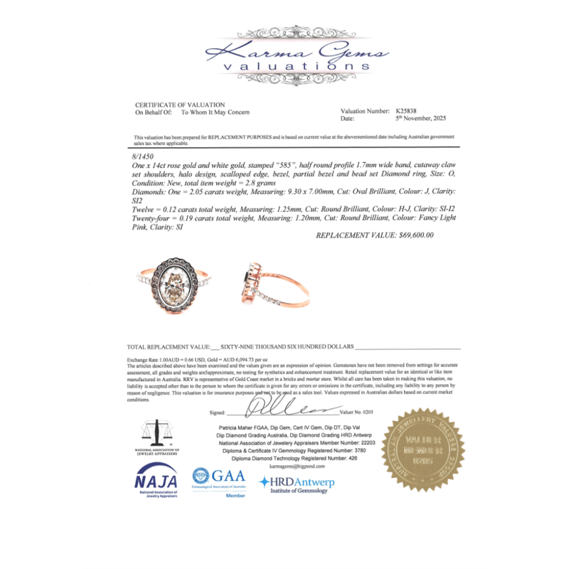 14K ROSE GOLD, FANCY PINK DIAMOND AND DIAMOND, HALO RING . The Centre Features, One Oval Brilliant Cut, Diamond (2.05Ct, J Colour, Si2 Clarity), Bezel Set. Surrounding The Centre In A Halo Are, 24 Round Brilliant Cut, Fancy Light Pink, Diamond (0.19Ct Tdw, Si Clarity), Partial Bezel Set. Decorating The Band Are, Round Brilliant Cut, Diamonds (0.12Ct Tdw, H-J Colour, Si-I2 Clarity), Bead Set. Ring Size O. Valuations Provided by an Independent Third-Party Professional Not Directly Associated With Lloyds Auctions at AUD $$69,600.00This valuation has been conducted by an independent third-party professional. The valuation amount is an assessment by the issuing valuer and does not reflect the auction value of the item. Any inquiries regarding the valuation should be directed to the issuing valuer (refer to contact details on the certificate), as Lloyds Auctions has no affiliation or influence over the valuation, the valuer, or the stated amount. Condition: Good - Refer Images 0645979+9423