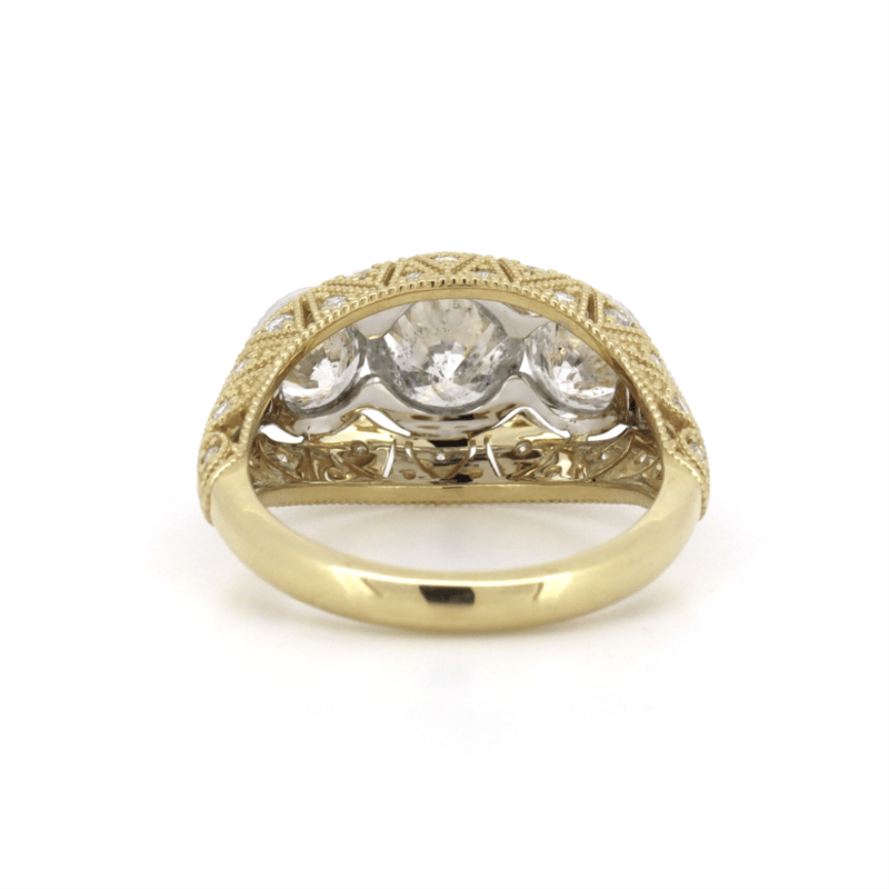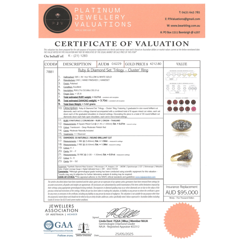 The Design Features 3 Round Brilliant Cut, Diamonds (2.88Ct Tdw, H-I Colour, Si2-P1 Clarity), Each Set In A Trilogy Channel Set. Encompassing The Design Are, 8 Square Mixed Cut, Deep Moderate Pinkish Red, Rubies (0.27Ct Tsw, Moderate Naturally Included-Clarity), Channel Set- Graduated. Surrounding The Design Are, 30 Round Brilliant Cut, Diamonds (0.31Ct Tdw, G-H Colour, Si1-Si2 Clarity), Microbead Setting. Ring Size Q.