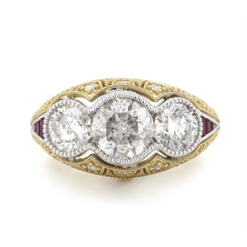 14K WHITE/YELLOW GOLD DIAMOND AND RUBY TRILOGY RING.