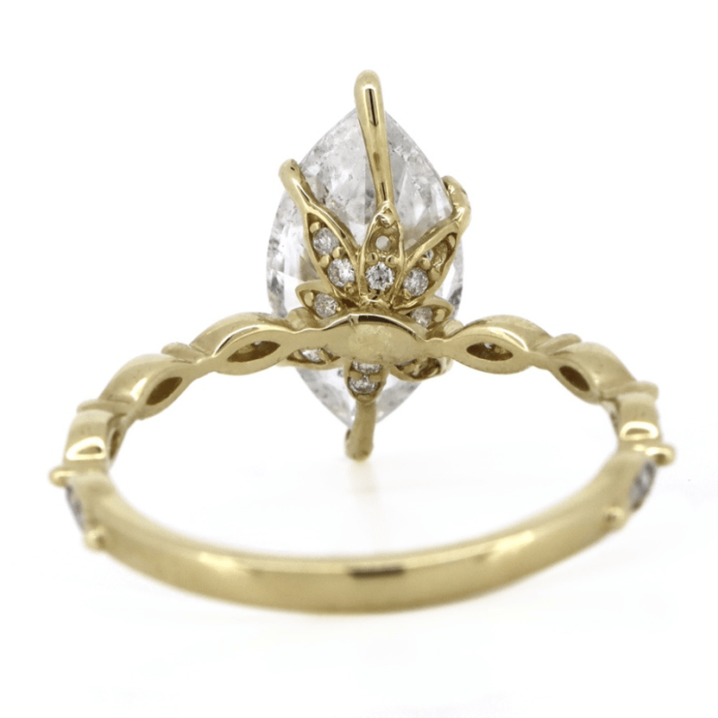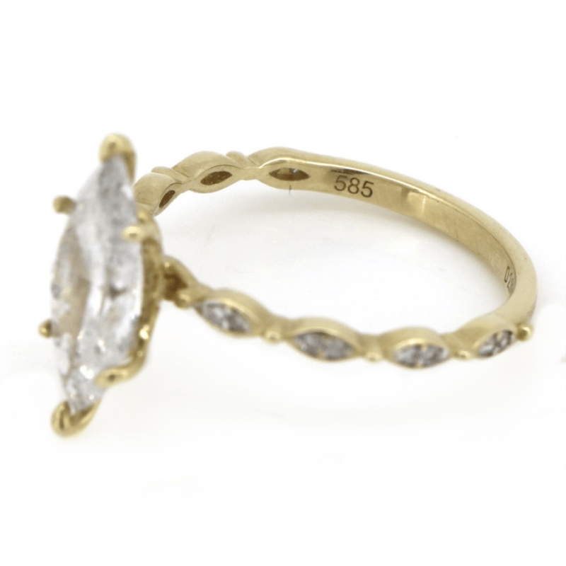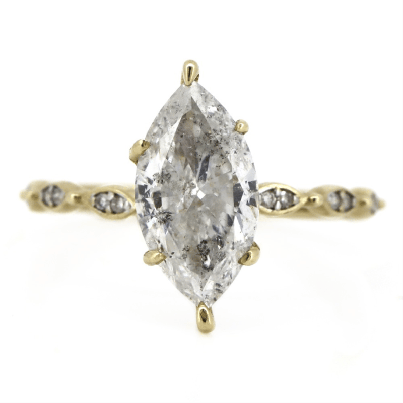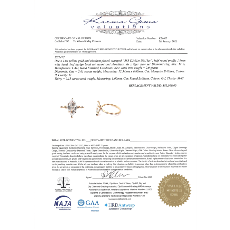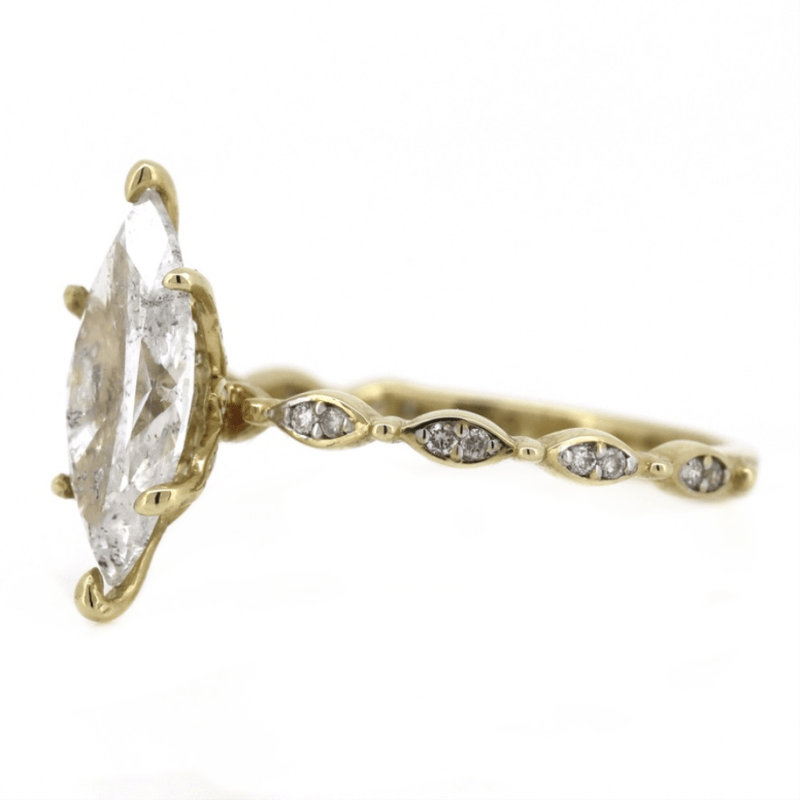 The Centre Features, One Marquise Brilliant, Diamonds (2.01Ct, H Colour, I2 Clarity), 6 Tiger-Claw Set. Decorating The Band Are, 30 Round Brilliant Cut, Diamonds (0.15Ct Tdw, G-I Colour, Si-I2 Clarity), Bead Set. Ring Size M 1/2.