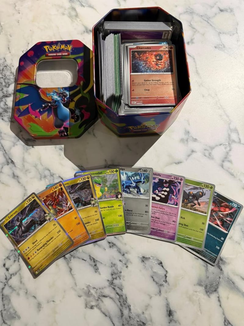 Assorted Bulk Pokemon Cards Including Reverse Holos, Over 200 Cards Included In Collectors Tin