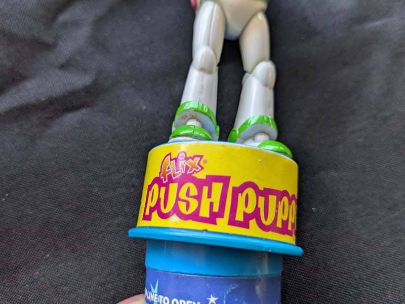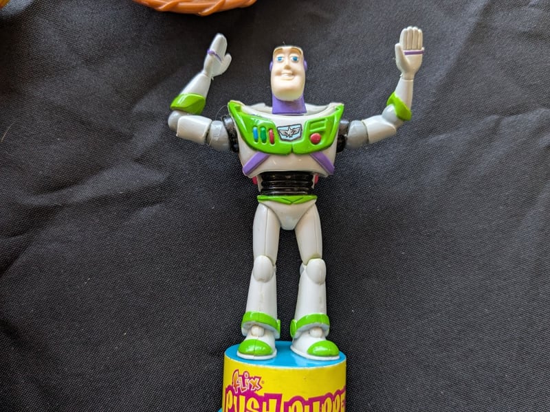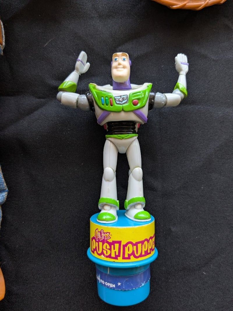 Lot Featuring Two Disney Pixar Toy Story Character Toys. Includes A Woody Talking Sheriff Doll With Guitar Accessory And Removable Cowboy Hat, Along With A Buzz Lightyear “Flix Push Puppet” Toy Mounted On A Push-Down Base.