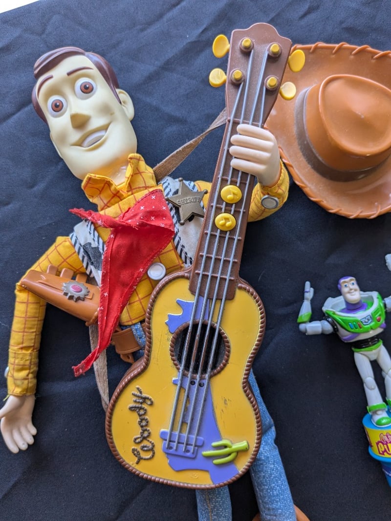 DISNEY PIXAR TOY STORY WOODY TALKING DOLL WITH GUITAR & BUZZ LIGHTYEAR PUSH PUPPET