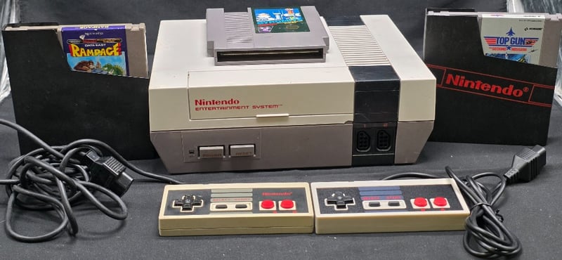 Nes With Two Nes Controllers And Cables, Pocket Games 150 In 1, Gyromite, Rampage, Top Gun Second Mission.