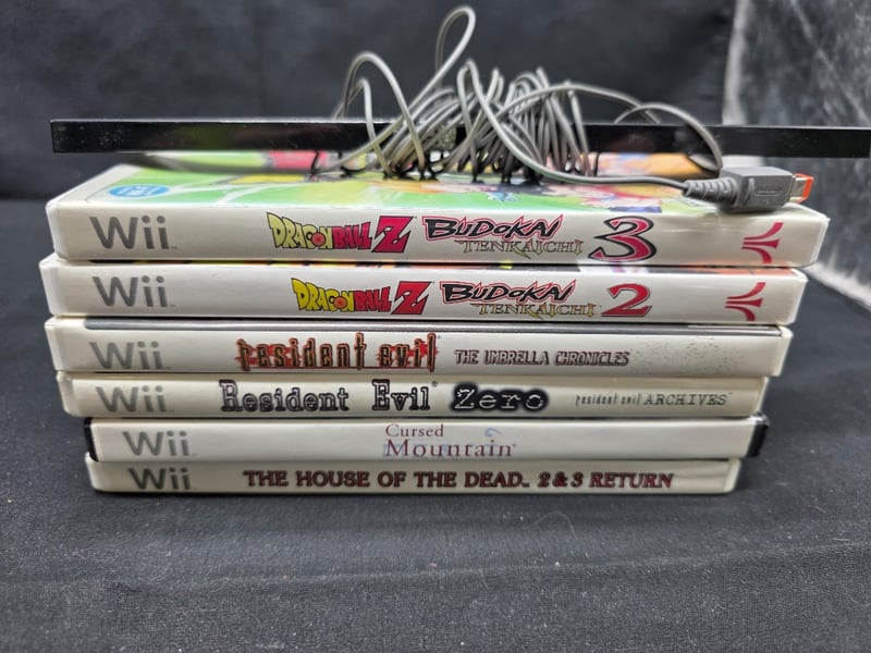 NINTENDO WII BUNDLE INCLUDING TWO CONTROLLERS, TWO NUNCHUCKS AND SIX GAMES Item Size: Height: 25cm, Width: 10cm, Depth: 30cm, Weight: 0.2Kg Games Included: 2X Dragon Ball Z Budokan 3, Resident Evil Umbrella Chronicles, Resident Evil 0, Cursed Mountain, The House Of The Dead 2&3 Return Unknown Working Condition, Marks, Scuffs, Dust. Condition: Fair - Refer To Images 584564+21