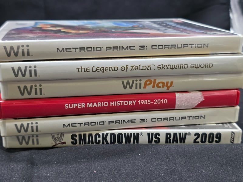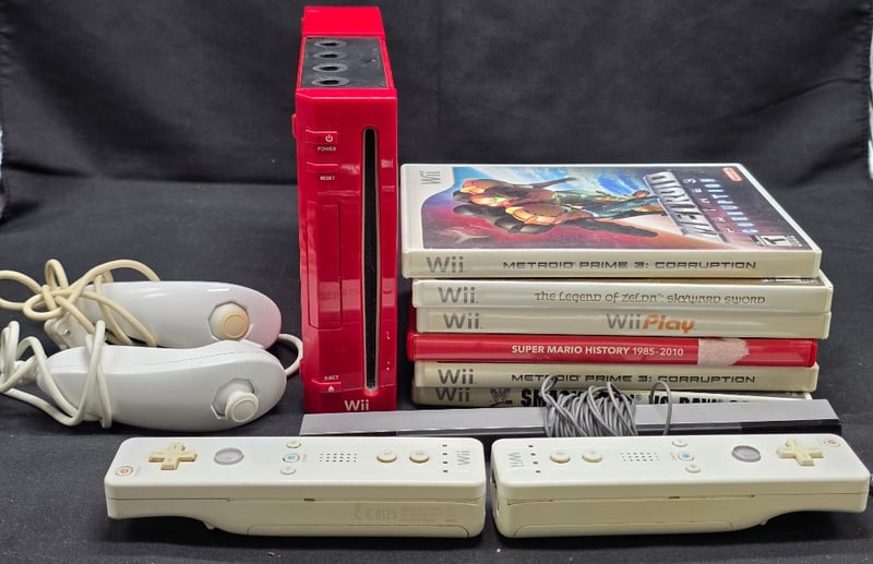 NINTENDO WII BUNDLE WITH TWO CONTROLLERS, TWO NUNCHUCKS AND SIX GAMES. Item Size: Height: 30cm, Width: 10cm, Depth: 20cm, Weight: 0.3Kg Games Included: Super Mario History 1985-2010, Wiiplay, Legend Of Zelda Skyward Sword, Method Prime 3, Smackdown Vs Raw 2009, Method Prime 3Unknown Working Condition, Marks, Scuffs, Dust. Condition: Good - Refer To Images 584564+20