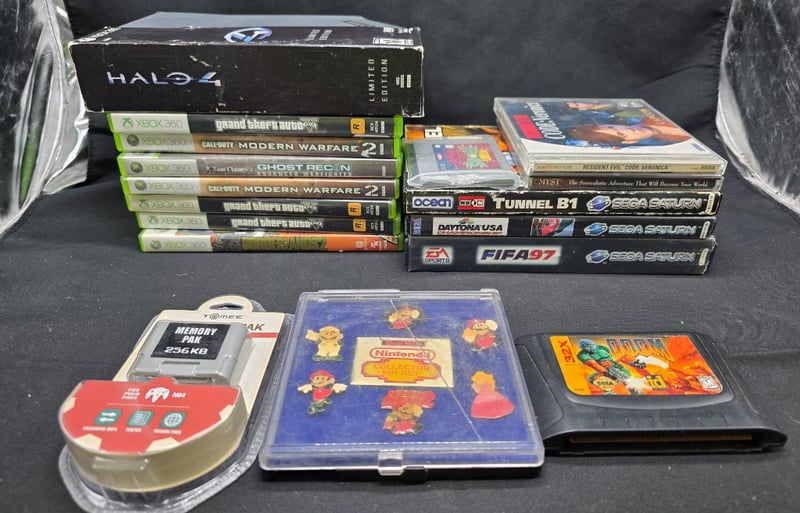 COLLECTION OF CONSOLE GAMES FROM XBOX 360, SEGA SATURN AND MORE Item Size: Height: 5cm, Width: 30cm, Depth: 30cm, Weight: 0.2Kg Collection Includes: Refer To Photos. Unknown Working Condition, Marks, Scuffs, Dust. Condition: Fair - Refer To Images 584564+15