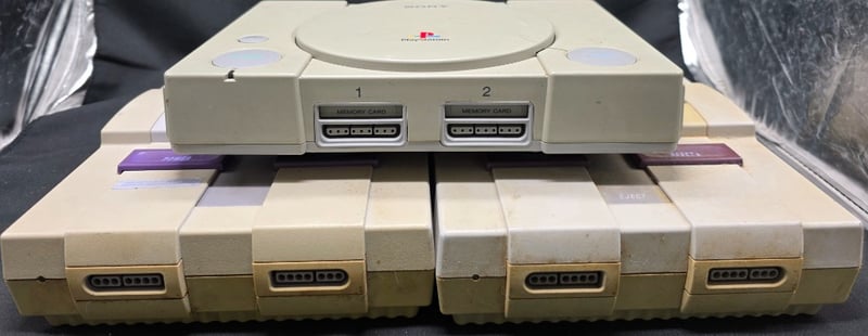 CONSOLE BUNDLE WITH ORIGINAL PLAYSTATION AND TWO SNES. FIXING REQUIRED Item Size: Height: 20cm, Width: 35cm, Depth: 35cm Vintage Gaming Console Collection Featuring Two Super Nintendo Entertainment System (Snes) In Off-White With Two Controller Ports Accompanied By An Original Sony Playstation (Ps1). Both Systems Wear Consistent With Age And Use.Snes Cover Removes Easily, Does Not Come With Cables Or Controllers, Unknown Working Condition, Marks, Scuffs, Dust. Condition: Poor - Refer To Images 584564+30