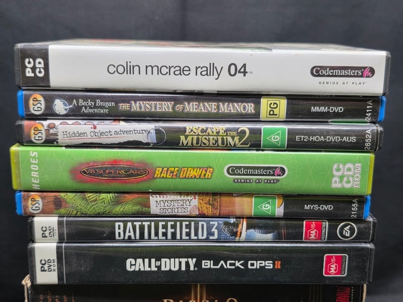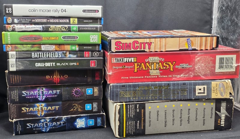 Comprehensive Collection Of Early 2000S Pc Gaming Titles And Educational Software Including Colin Mcrae Rally 04, Battlefield 3, Call Of Duty Black Ops Ii, Diablo Iii, Starcraft Ii Expansions (Wings Of Liberty, Heart Of The Swarm, Legacy Of The Void), Simcity, Ultimate Fantasy Compilation, Star Wars Rebel Assault Ii, And Various Adventure Titles. Includes Original Boxed Copies With Discs, Manuals, And Case Materials. Unknown Working Condition, Marks, Scuffs, Dust.