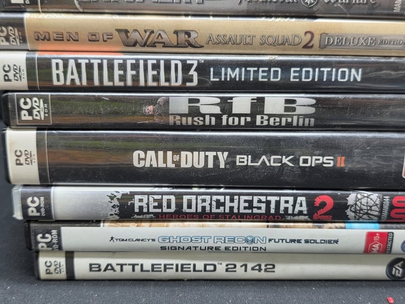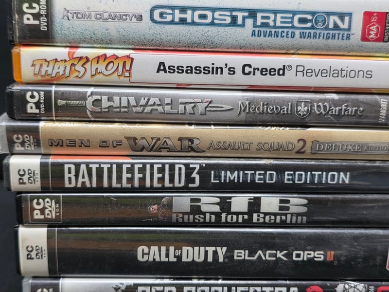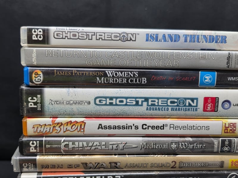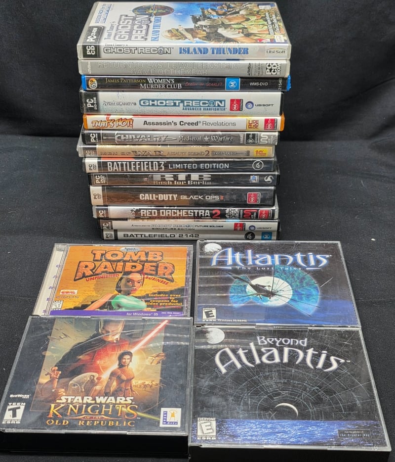 Comprehensive Collection Of Pc Gaming Titles Featuring Tactical Shooters, Action-Adventure Games, And Strategy Titles. Stack Includes Ghost Recon Island Thunder, Return To Castle Wolfenstein Game Of The Year, Women'S Murder Club, Ghost Recon Advanced Warfighter, Assassin'S Creed Revelations, Chivalry Medieval Warfare, Men Of War Assault Squad 2 Deluxe Edition, Battlefield 3 Limited Edition, Rush For Berlin, Call Of Duty Black Ops Ii, Red Orchestra 2, Battlefield 2142, Tomb Raider, Atlantis The L