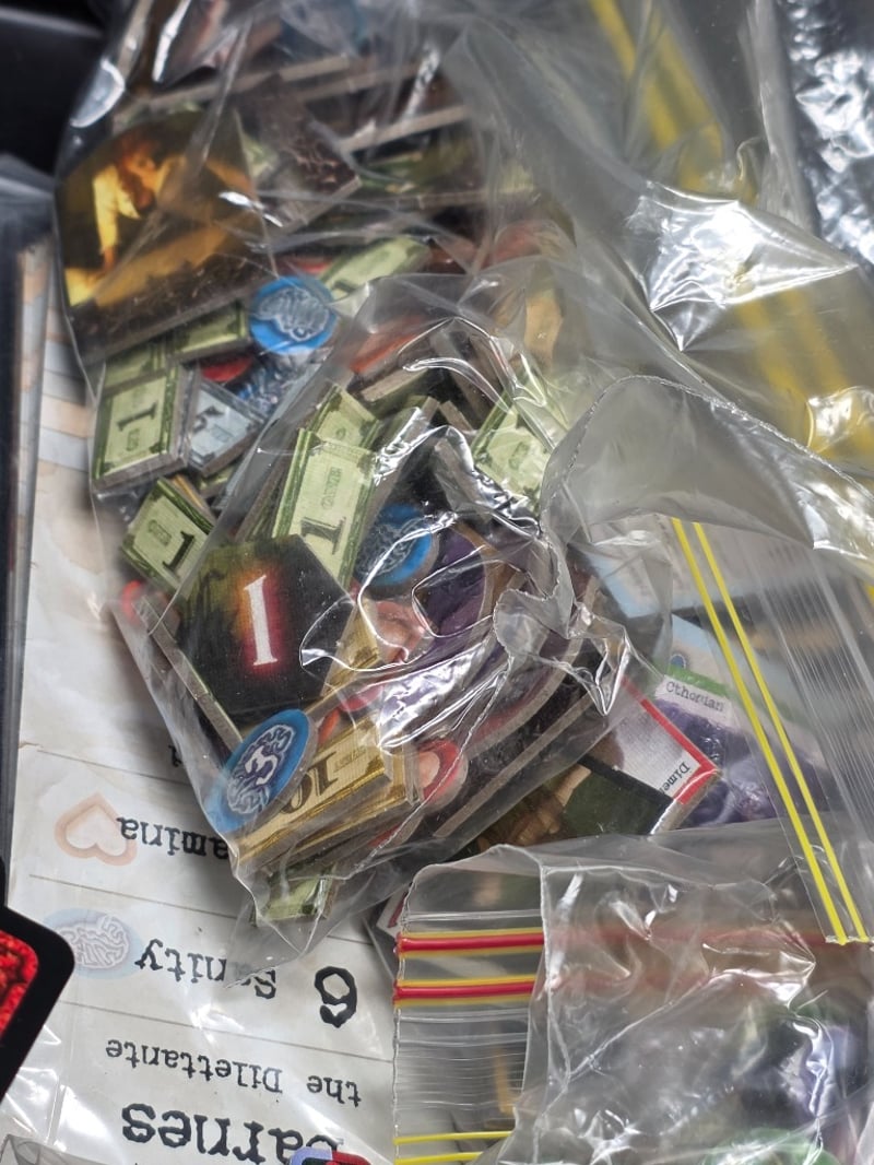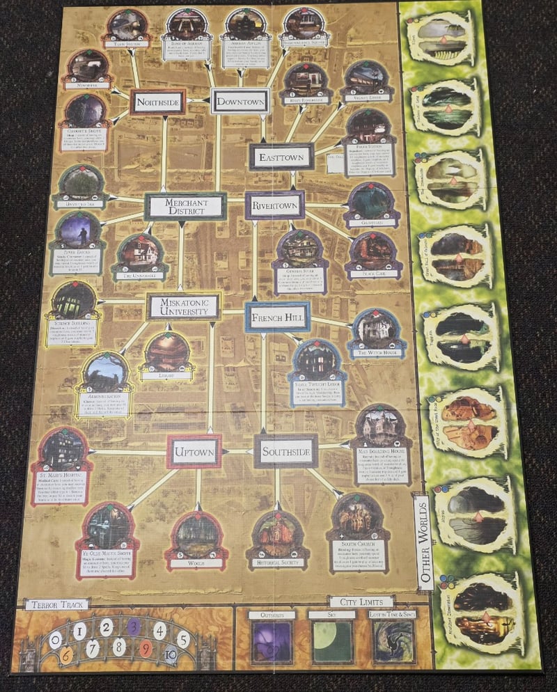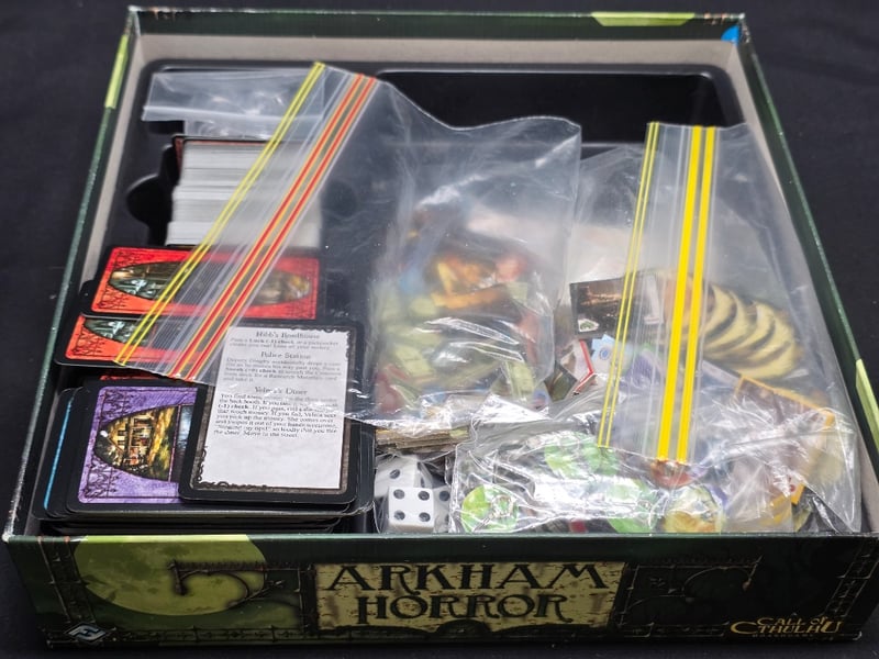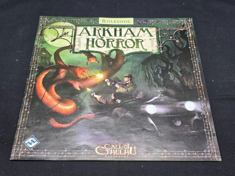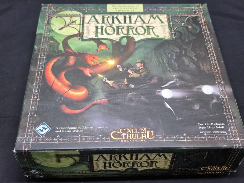 ARKHAM HORROR CALL OF CTHULHU BOARDGAME - REVISED EDITION Item Size: Height: 15cm, Width: 35cm, Depth: 35cm, Weight: 0.3Kg Complete Revised Edition Boardgame Featuring Thematic Lovecraftian Adventure Mechanics. Includes Game Board Depicting Arkham City Districts, Rulebook, Location Cards With Atmospheric Artwork, Investigator Tokens, Monster Figurines, Spell And Clue Tokens, Sanity Markers, Stamina Counters, And Comprehensive Card Decks In Original Packaging. Components Organized In Segmented Storage Trays With Protective Sleeves. Designed For 1-8 Players, Ages 14 And Adult. Published By Fantasy Flight Games, Design Condition: Good - Refer To Images 584564+9