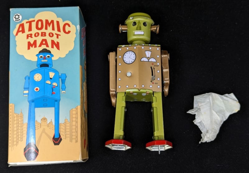 ATOMIC ROBOT MAN WINDUP COLLECTOR ITEMFigure Size: 14Cm H X 7Cm W X 4.5Cm D, In Original BoxCondition: Good - Refer To Images6B582912+9