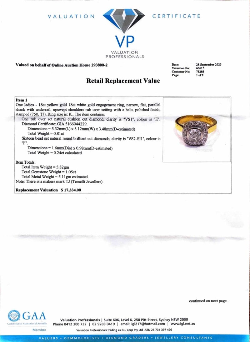 One Ladies 18Ct Yellow Gold 18Ct White Gold Engagement Ring, Narrow, Flat, Parallel Shank With Underrail, Upswept Shoulders Rub Over Setting With A Halo, Polished Finish. Stamped (750, Tj). Ring Size Is: K..