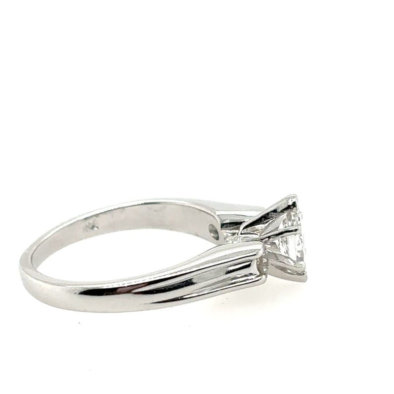 One Ladies Patterned 14Ct White Gold Engagement Ring, Narrow, Low Half Round, Tapered Shank, Extended Shoulders, 6 Claw Setting, Polished Finish, Stamped (14K). Ring Size Is: N2..