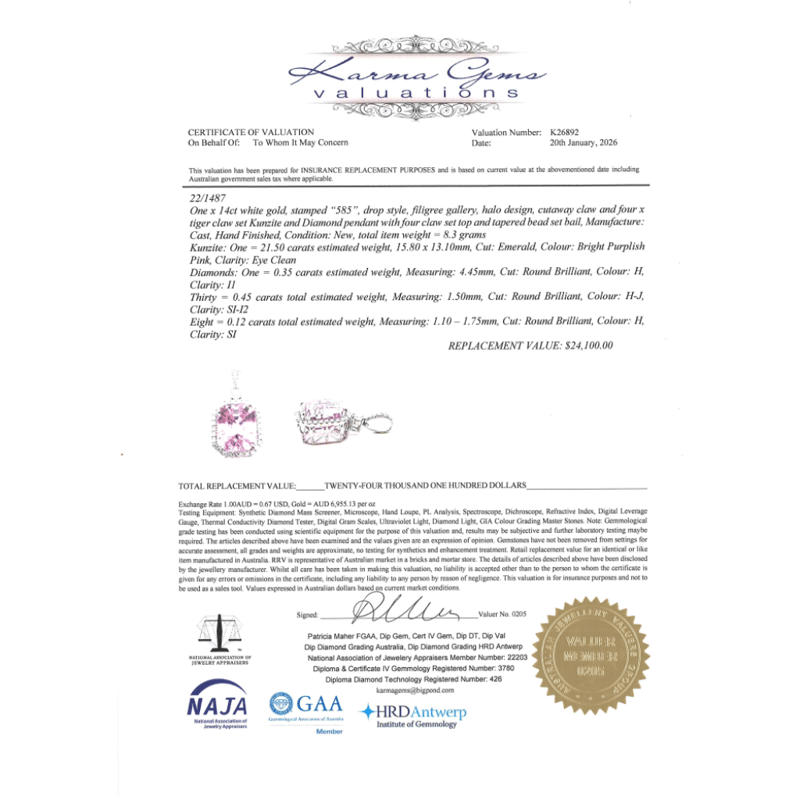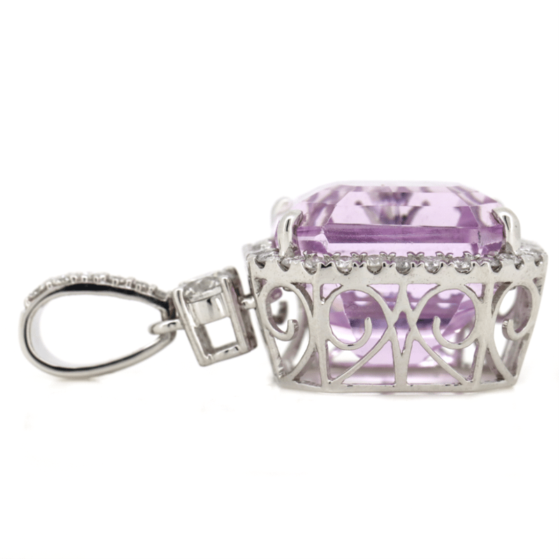 The Centre Features, One Emerald Cut, Bright Pink, Kunzite (21.50Ct, Eye Clean Clarity), 4 Claw Set. Surrounding The Centre In A Halo Are, 30 Round Brilliant Cut, Diamonds (0.45Ct Tdw, H-J Colour, Si-I2 Clarity), Micro-Claw Set. Surmounted By, One Round Brilliant Cut, Diamond (0.35Ct, H Colour, I1 Clarity), 4 Claw Set. Decorating The Bail Are, 8 Round Brilliant Cut, Diamonds (0.12Ct Tdw, H Colour, Si Clarity), Claw Set. The Basket Features A Filigree Design.