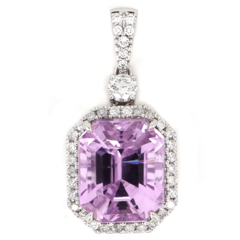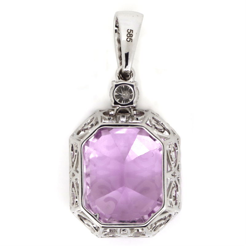14K WHITE GOLD, KUNZITE AND DIAMOND, HALO STATEMENT PENDANT.