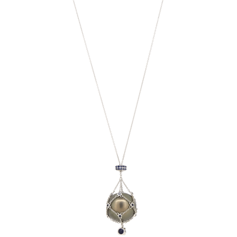 14K WHITE GOLD, BLACK CULTURED TAHITIAN PEARL AND BLUE SAPPHIRE, CAGE NECKLACE.
