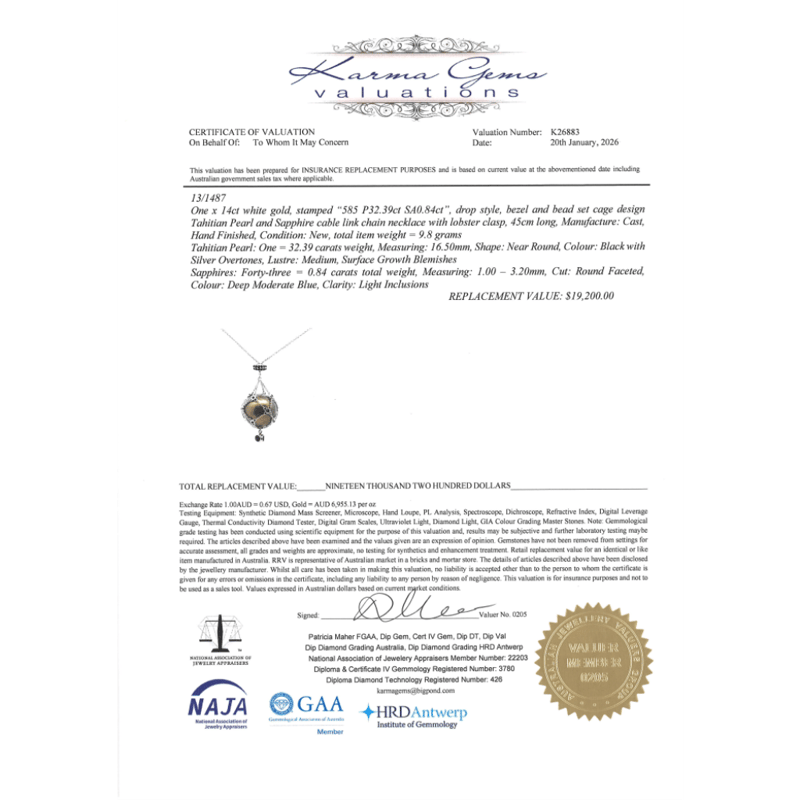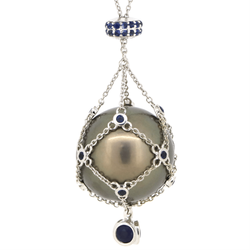 The Design Features, One Near Round, Black With Silver Overtones, Cultured Tahitian Pearl (32.39Ct/16.50Mm Size, Medium Lustre, Surface Growth Blemishes), Unset In "Cage" Style Chain. The Design Features, 43 Round Faceted Cut, Deep Moderate, Blue Sapphires (0.84Ct Tsw, Slightly Included), Bezel Set. The Necklace Has A Lobster Claw Clasp. Necklace Length Is 45Cm.
