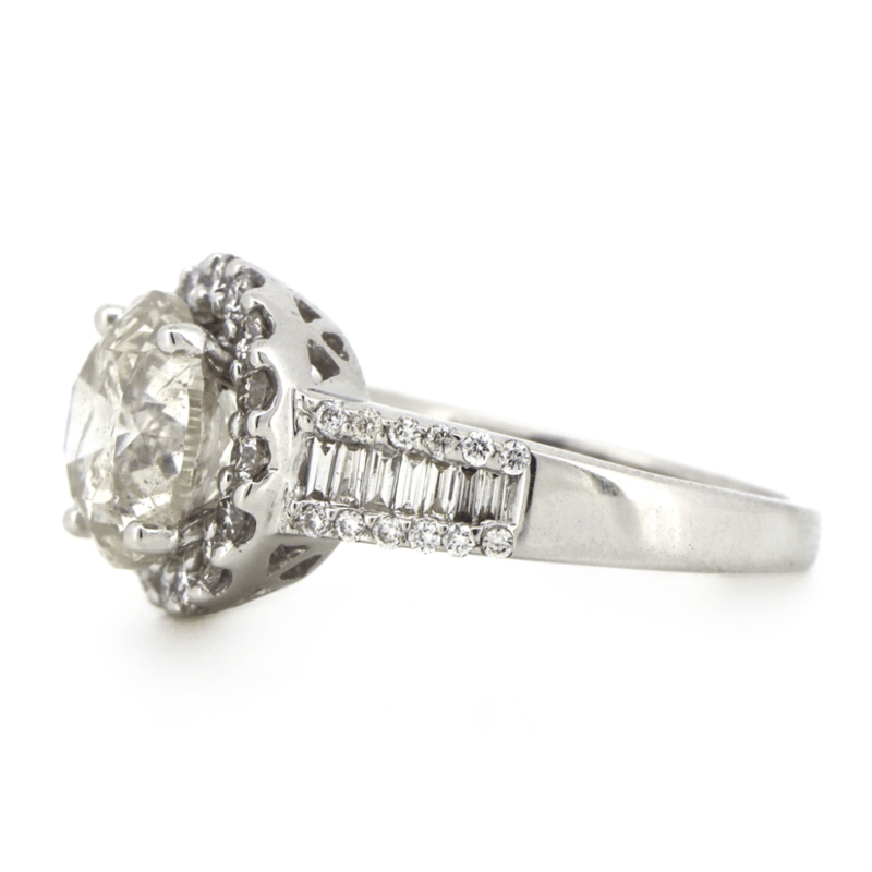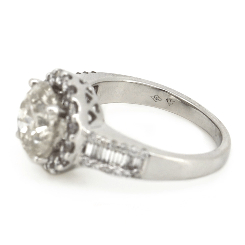 The Centre Features, One Round Brilliant Cut, Diamond (3.51Ct, I-J Colour, Si1- Clarity), 4 Claw Basket Set. Surrounding The Design Are, 40 Round Brilliant Cut, Diamonds (0.28Ct Tdw, F-G Colour, Vs2- Si1 Clarity), Micro/Bead Setting. Decorating The Shoulders Are, 14 Baguette, Diamonds (0.60Ct Tdw, F-G Colour, Vs2- Si1 Clarity), Channel Set. Ring Size N.