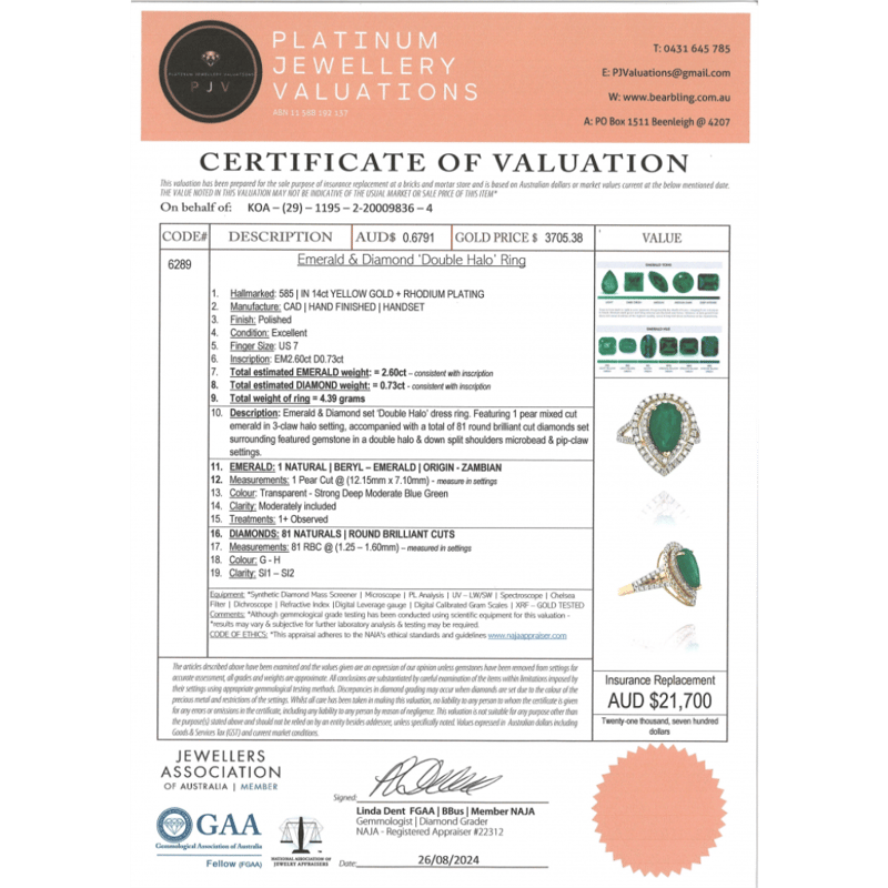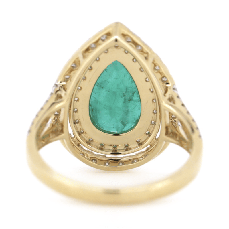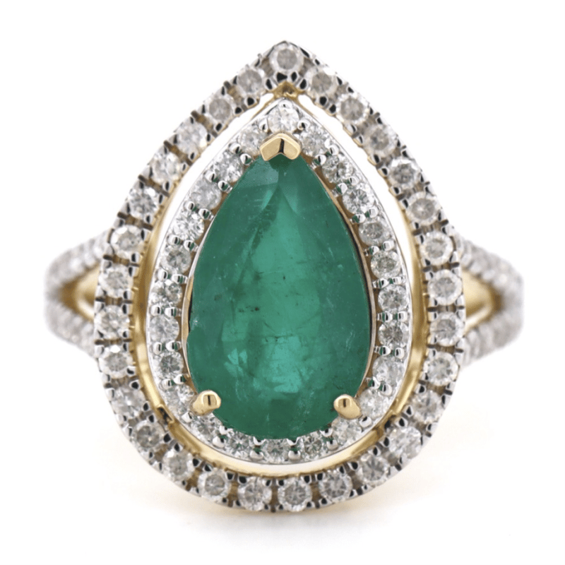 The Centre Features, One Pear Cut, Deep Moderate Bluish-Green, Zambian Emerald (2.60Ct, Moderately Included), 3 Claw Set. Surrounding The Centre In A Double Halo And Decorating The Split Band Are, 81 Round Brilliant Cut, Diamonds (0.73Ct Tdw, G-H Colour, Si1-Si2 Clarity), Micro-Bead/Pip-Claw Set. Ring Size N.