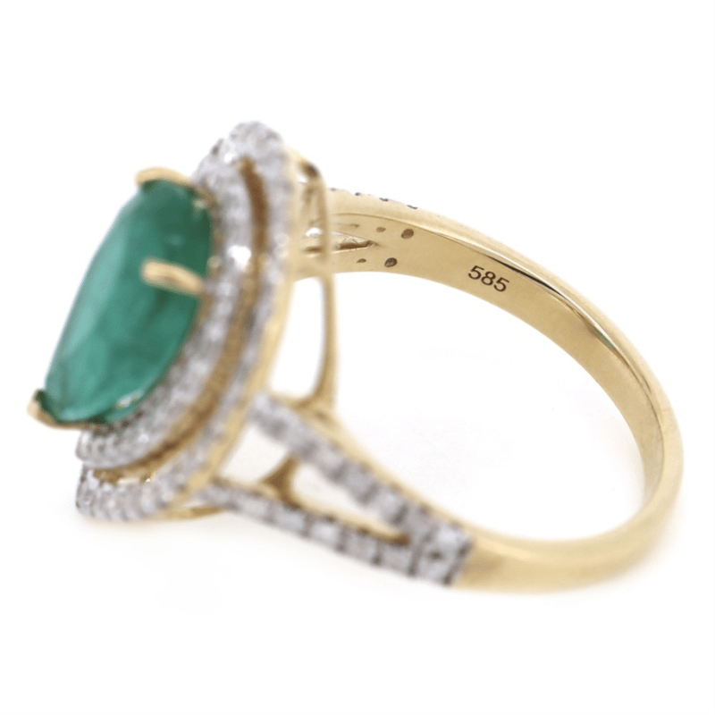 14K YELLOW GOLD, 2.60CT ZAMBIAN EMERALD AND DIAMOND, DOUBLE HALO SPLIT BAND RING.