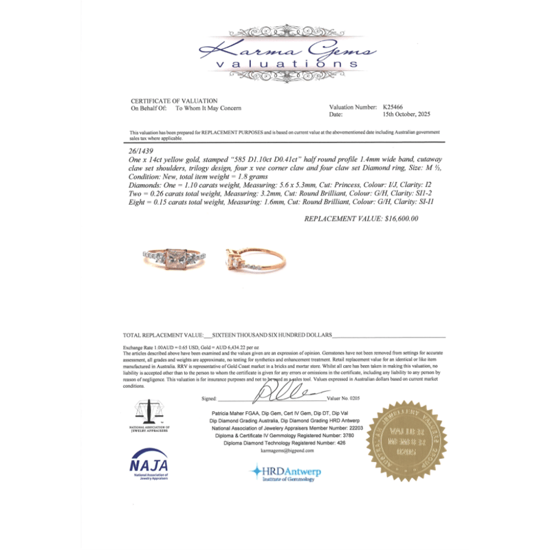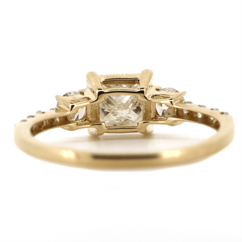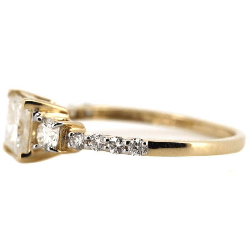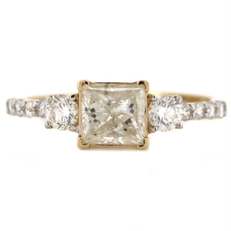 The Centre Features, One Square Princess Cut, Diamond (1.10Ct, I-J Colour, I2 Clarity), Claw Set. Flanking The Centre Are, 2 Round Brilliant Cut, Diamonds (0.26Ct Tdw, G-H Colour, Si1-I2 Clarity), Claw Set. Decorating The Band Are, 8 Round Brilliant Cut, Diamonds (0.15Ct Tdw, G-H Colour, Si-I1 Clarity), Pip-Claw Set. Ring Size M 1/2.