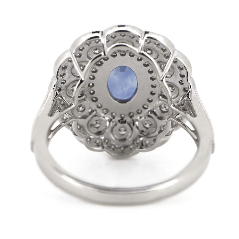 The Centre Features, One Oval Mixed Cut, Moderate Blue, Ceylon Sapphire (1.12Ct, Slightly Included), 4 Claw Set. Embellishing The Design Are, 92 Round Brilliant Cut, Diamonds (0.61Ct Tdw, G-H Colour, Si1-Si2 Clarity), Bead/Bezel Set. Ring Size O 1/2.